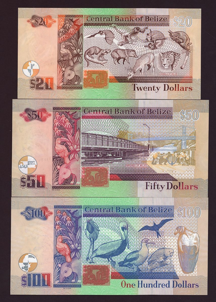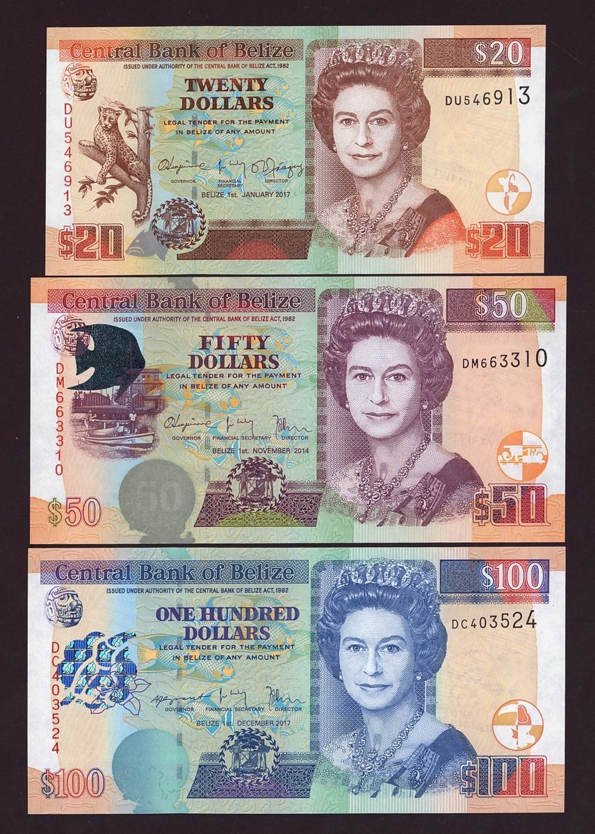 (x) Belize, Central Bank, three notes, $20, $50, $100, 2014-2017, (Pick 69f, 70e, 71d, BNB 327f, 328e, 329d,), about uncirculated to uncirculated