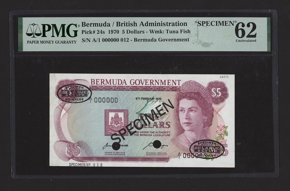 (x) Bermuda, British Administration, specimen 5 Dollars, 6th February 1970, serial number A/1 000000 012, (Pick 24s, BNB 125), in PMG holder 62 Uncirculated