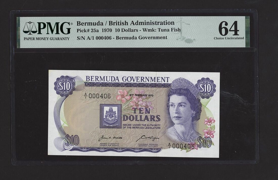 (x) Bermuda / British Administration, 10 Dollars, 6th February 1970, serial number A/1 000406, (Pick 25a, BNB 126a), in PMG holder 64 Choice Uncirculated