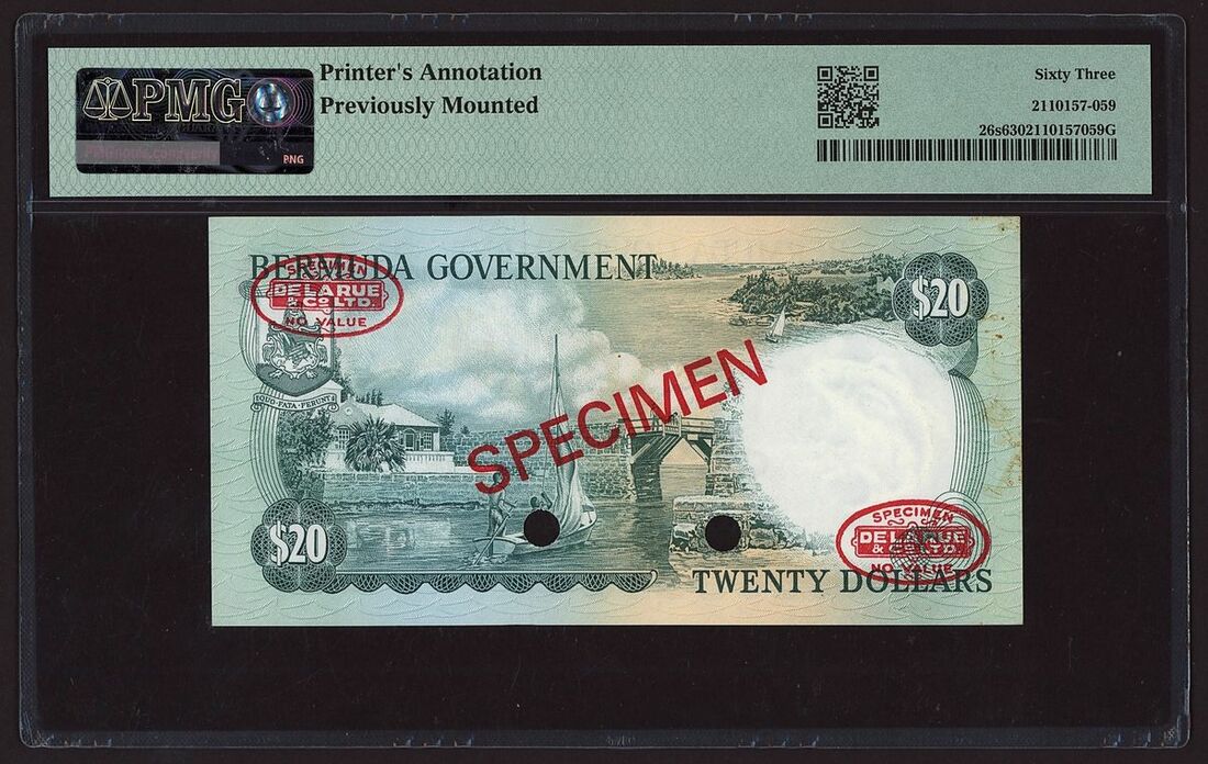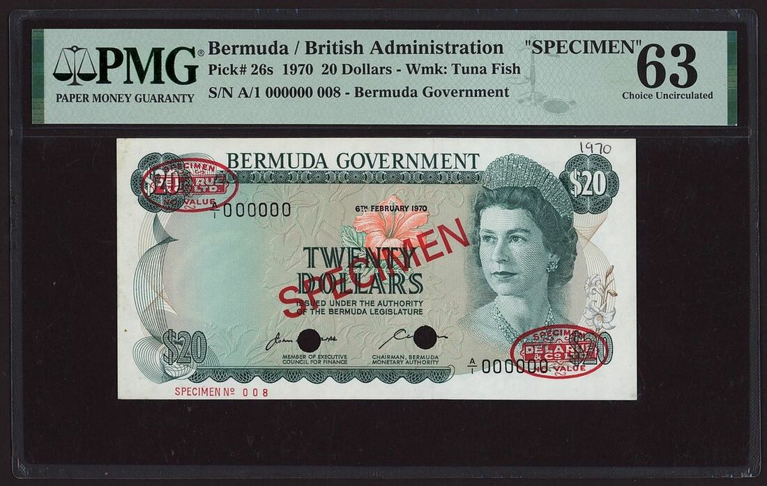(x) Bermuda, British Administration, specimen 20 Dollars, 6th February 1970, serial number A/1 000000 008, (Pick 26s, BNB 127), in PMG holder 63 Choice Uncirculated