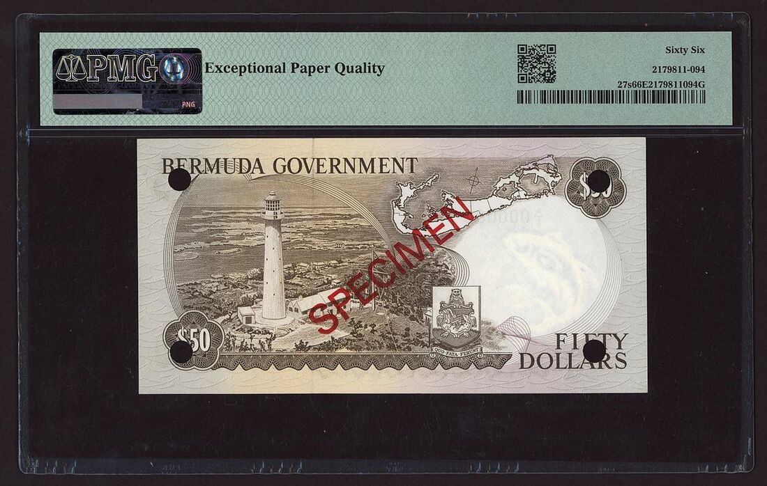 (x) Bermuda, British Administration, specimen 50 Dollars, 6th February 1970, serial number A/1 000000 018, (Pick 27s, BNB 128), in PMG holder 64 Choice Uncirculated