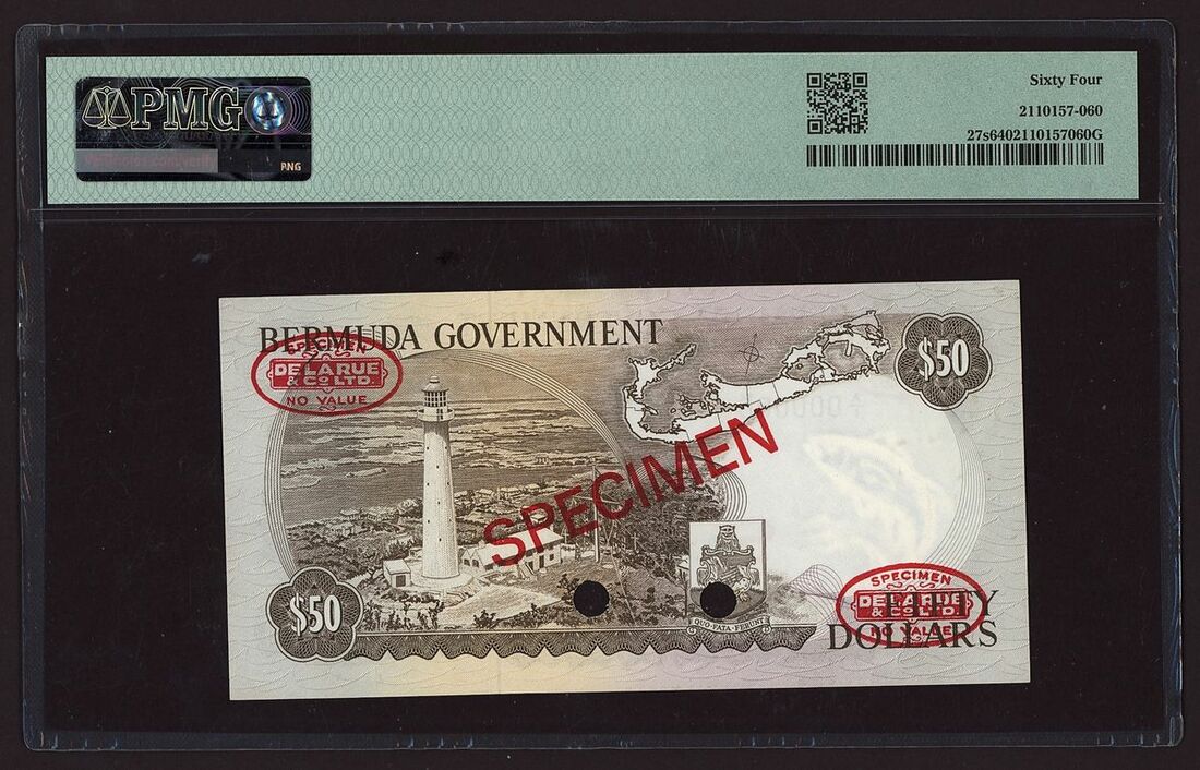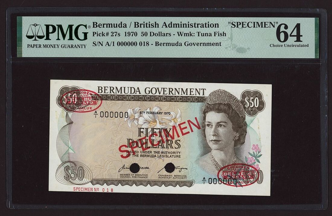 (x) Bermuda, British Administration, specimen 50 Dollars, 6th February 1970, serial number A/1 000000, (Pick 27s, BNB 128), in PMG holder 66 EPQ Gem Uncirculated