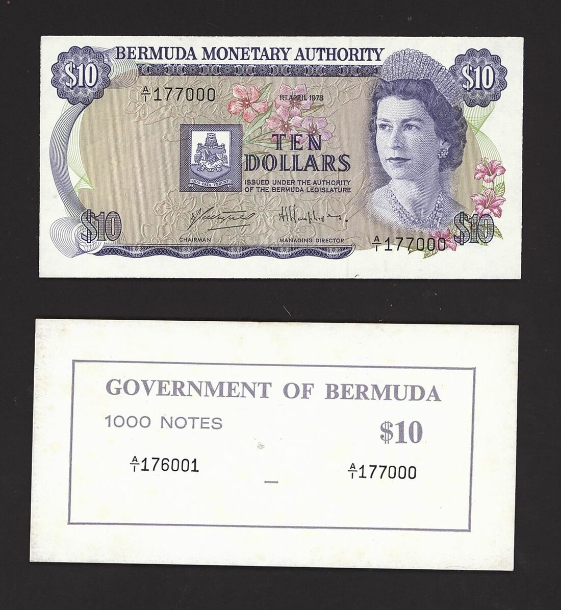 (x) Bermuda Monetary Authority, Government of Bermuda, 10 Dollars, 1st April 1978, serial number A/1 177000, (Pick 30, BNB 203), with original brick card, last banknote of the brick