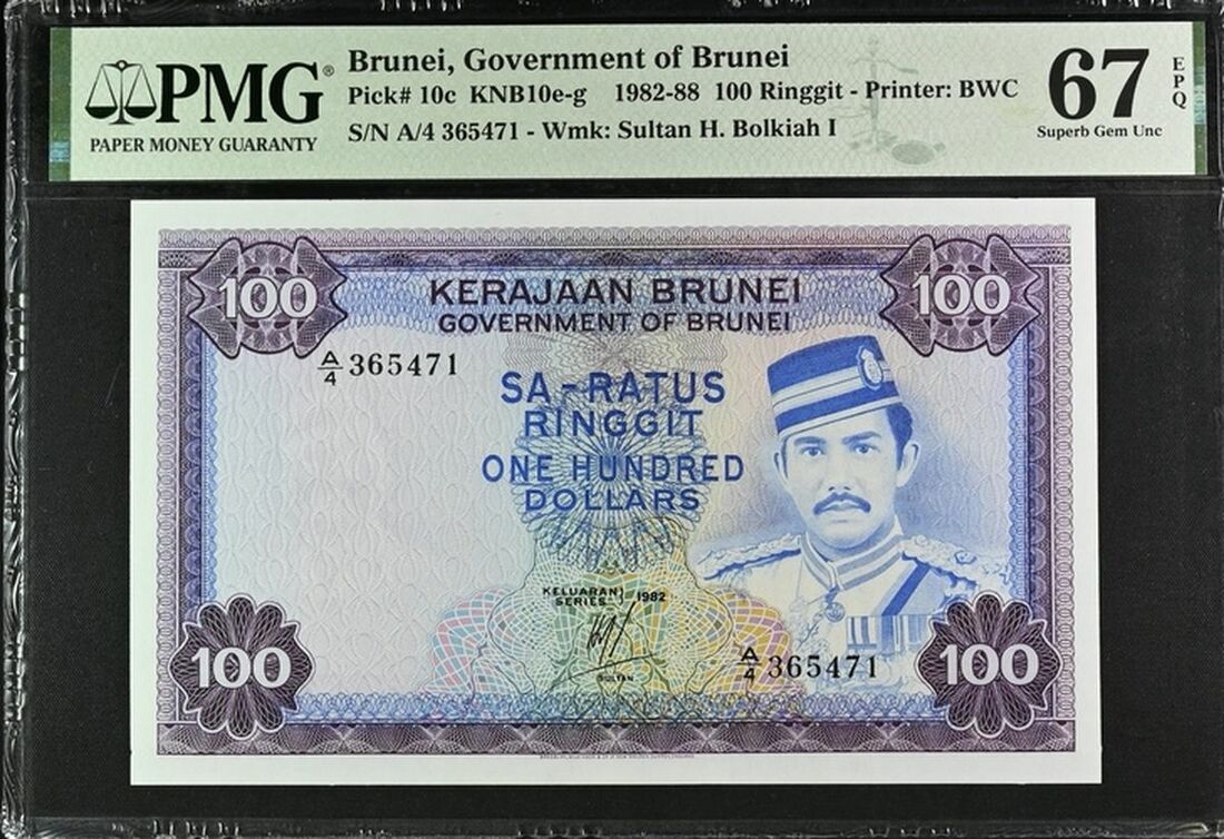 Government of Brunei, 100 Ringgit, 1982, serial number A/4 365471, (Pick 10, BNB 110e), in PMG holder 67 EPQ Superb Gem Uncirculated, only 3 notes in higher grade