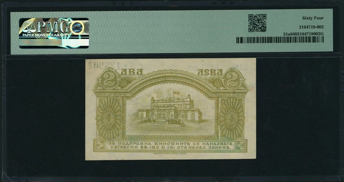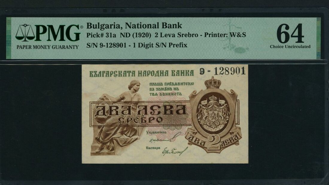 Bulgaria National Bank 2 Leva Srebro, ND (1920), serial number 9-128901, (Pick 31a, BNB 139), in PMG holder 64 Choice Uncirculated