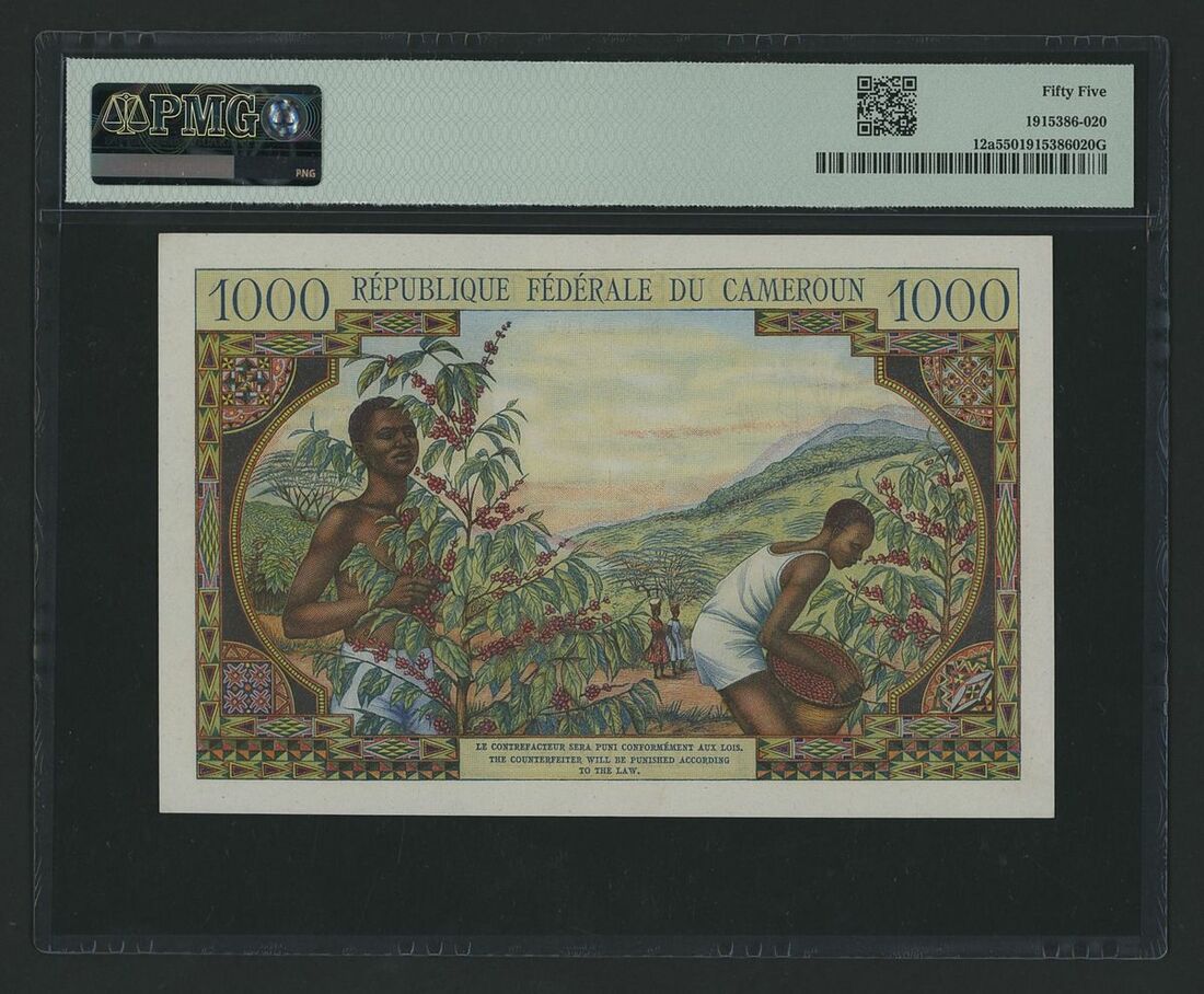 Banque Centrale, Cameroun, 1000 Francs, ND (1962), serial number U2 46196, (Pick 12, BNB 306), in PMG holder 55 About Uncirculated