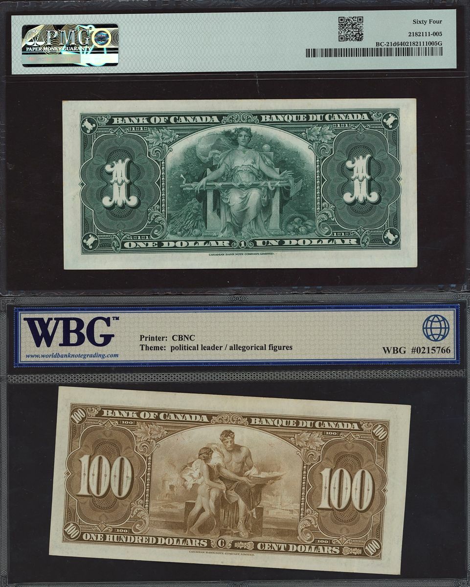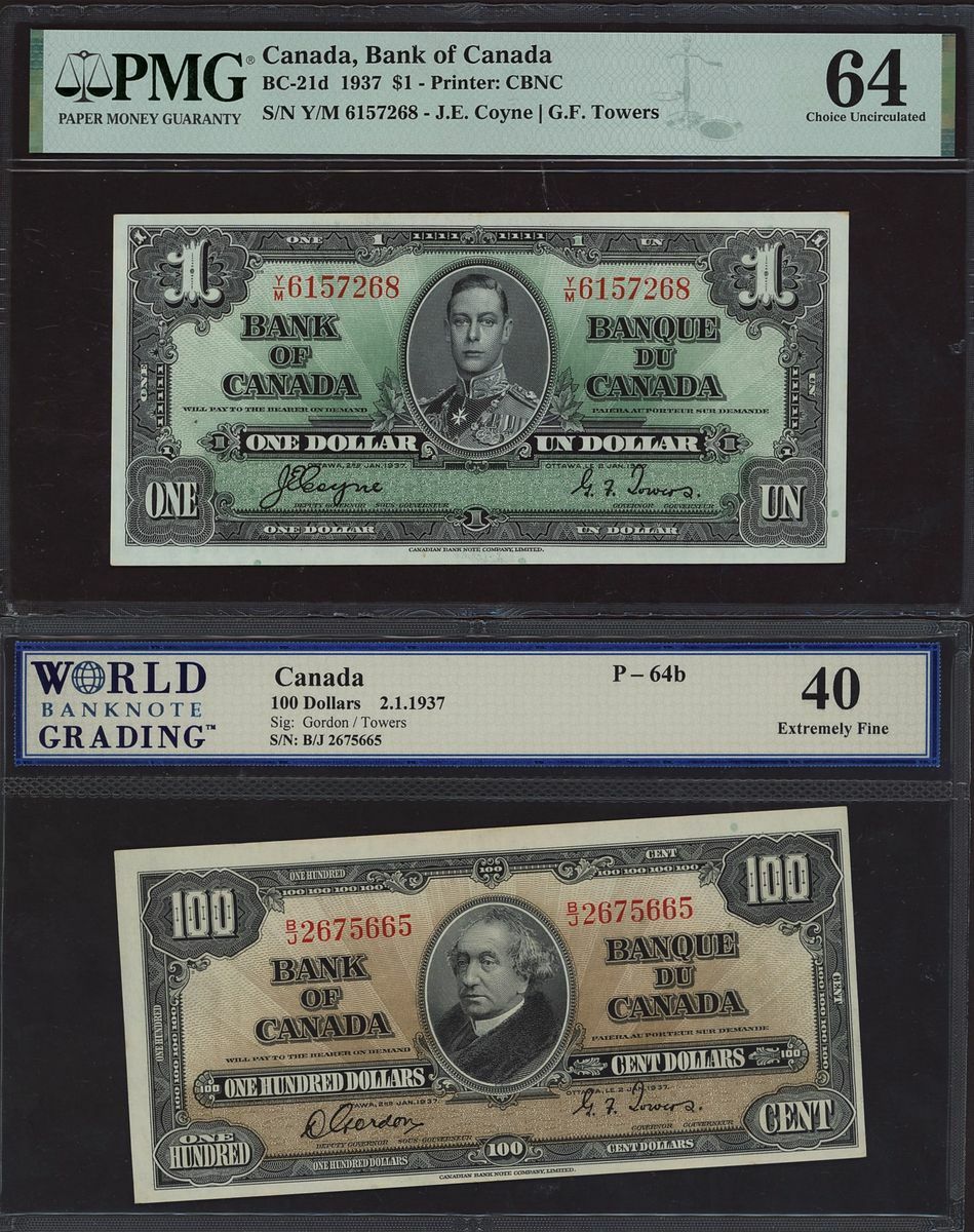 (x) Bank of Canada, three $1, one $100, 1937, wide signature panel on two of the $1
