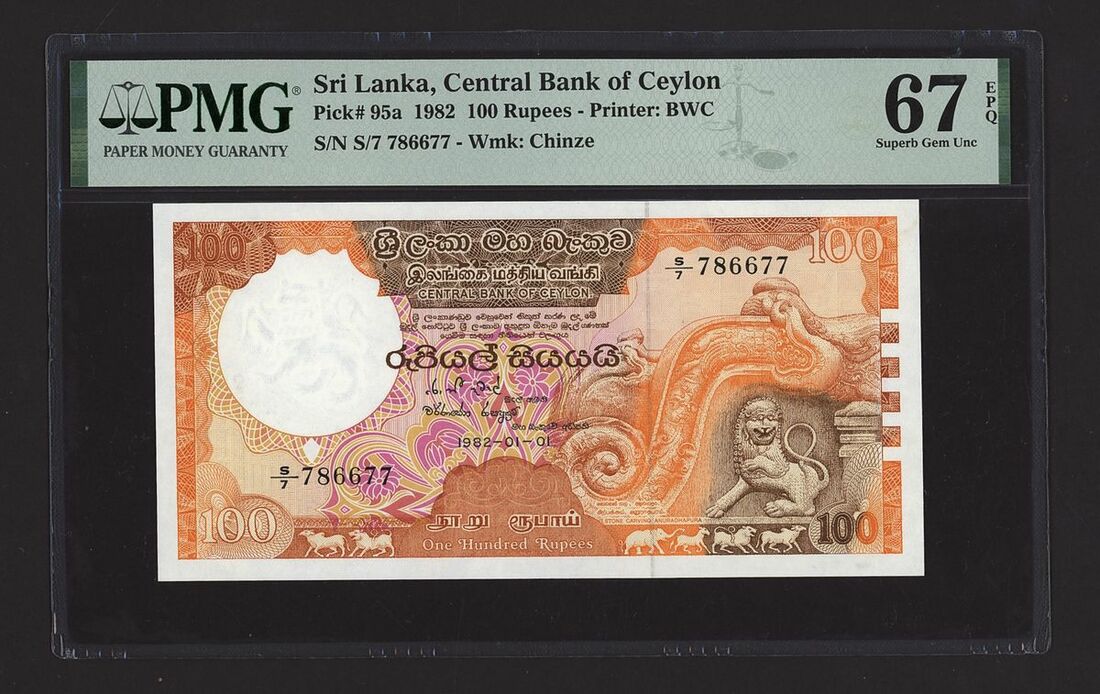 (x) Central Bank of Ceylon, Sri Lanka, [Top Pop] 100 Rupees, 1st January 1982, serial number S/7 786677, (Pick 95a, BNB 347), in PMG holder 67 EPQ Superb Gem Uncirculated