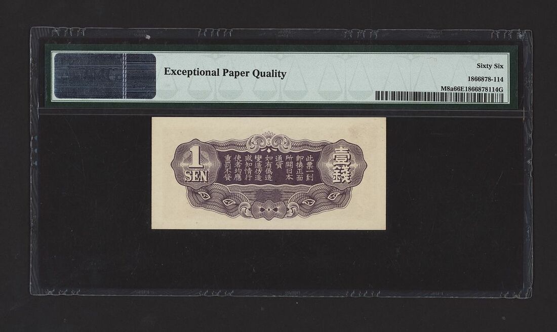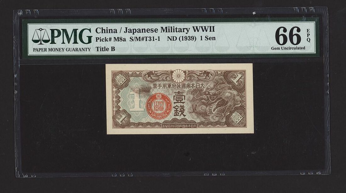 (x) Japanese Military WWII, China, 1 Sen, ND (1939), Title B, (Pick M8a S/M T31-1), in PMG holder 66 EPQ Gem Uncirculated