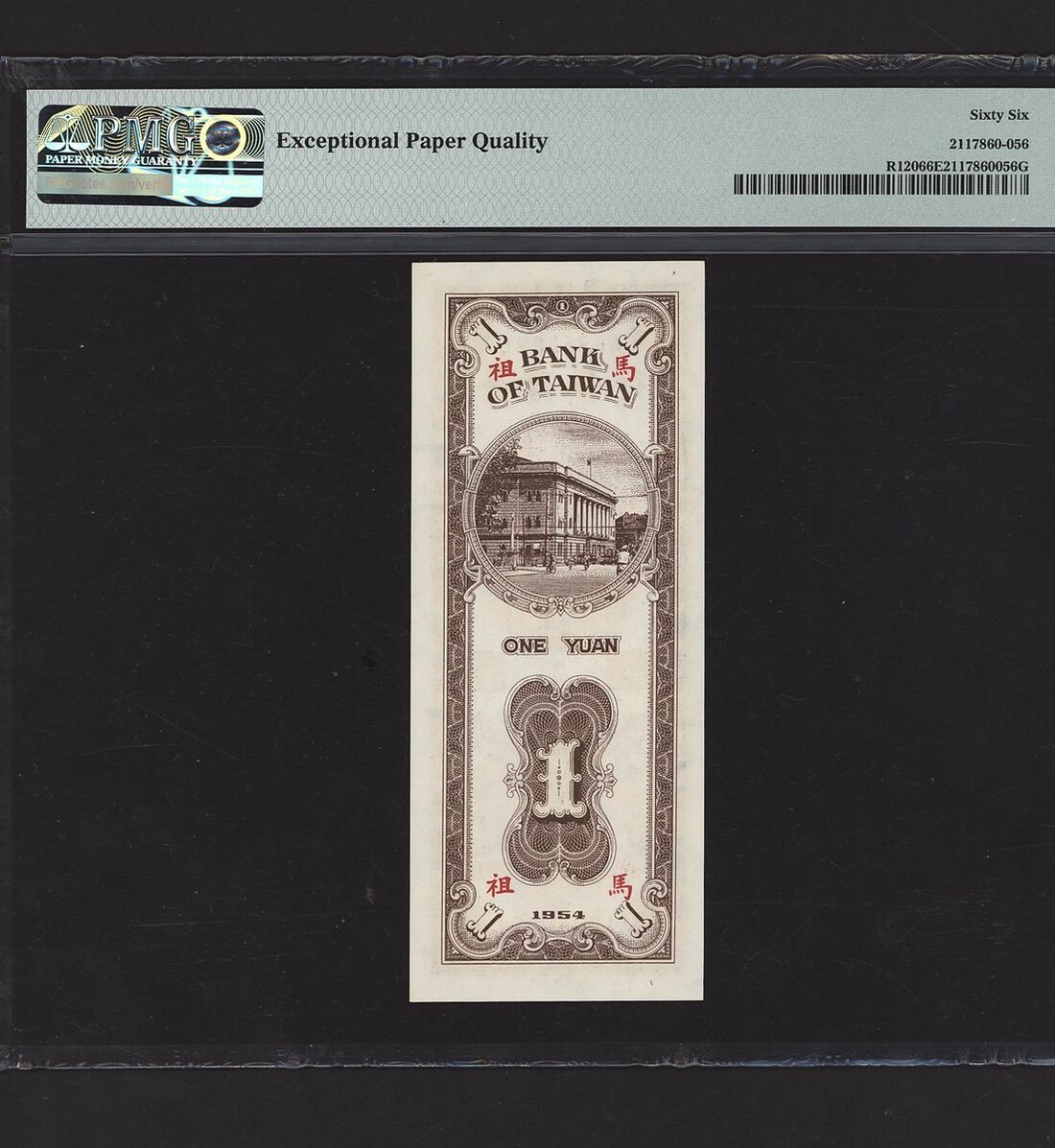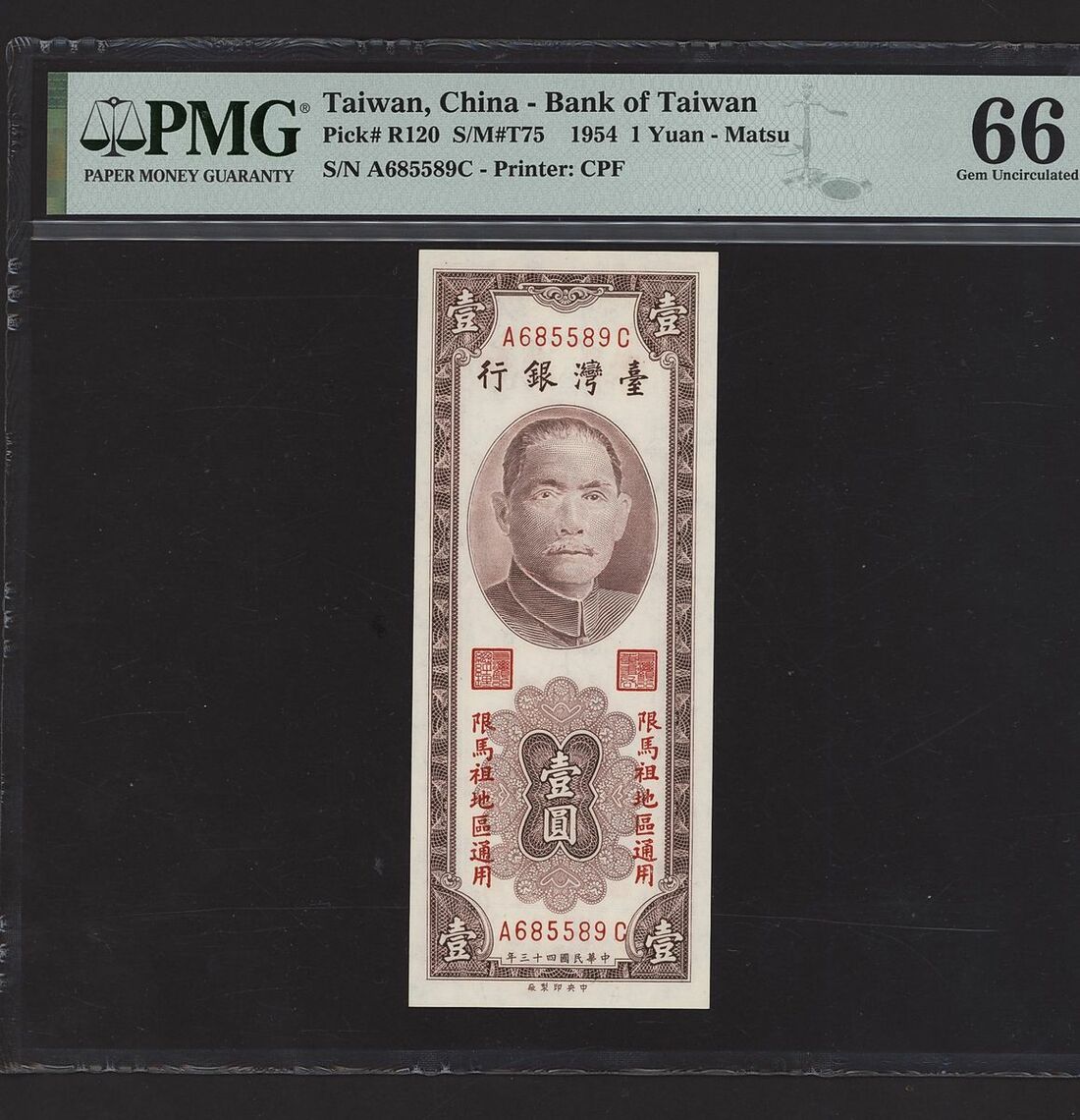 (x) Bank of Taiwan, Taiwan, China, 1 Yuan - Matsu, 1954, serial number A685589C, (Pick R120, S/M T759, in PMG holder 66 EPQ Gem Uncirculated