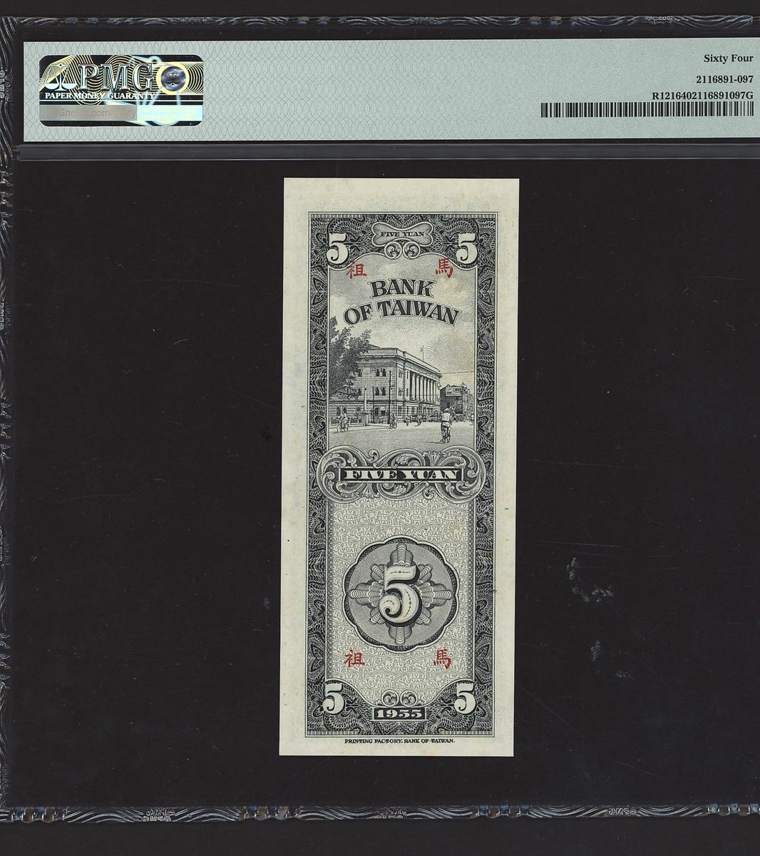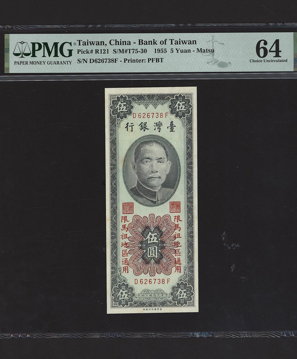 (x) Bank of Taiwan, Taiwan, China, Consecutive pair of 5 Yuan - Matsu, 1955, D 626738-39 F, (Pick R121, S/M#T75-30), in PMG holder 64 Choice Uncirculated (2 notes)