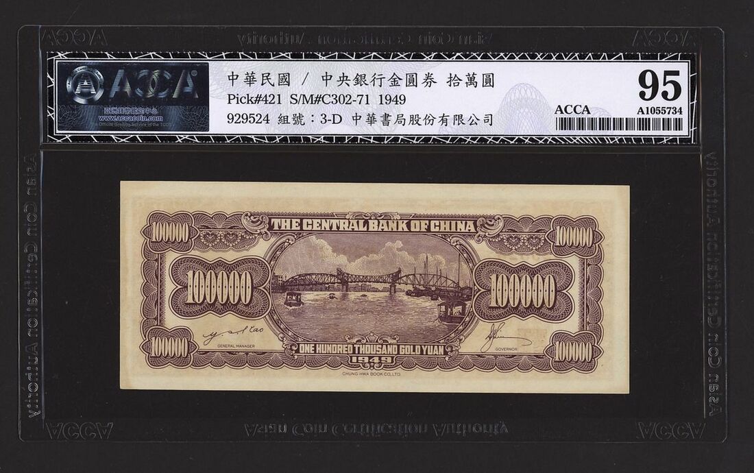 (x) The Central Bank of China, Republic of China, 100.000 Yuan, 1949, serial number 929524, (Pick 421, S/M C302-71), in ACCA holder 65 Gem Uncirculated, stain