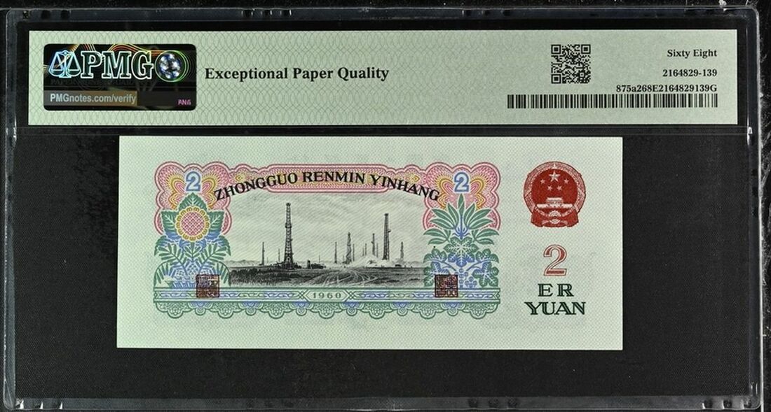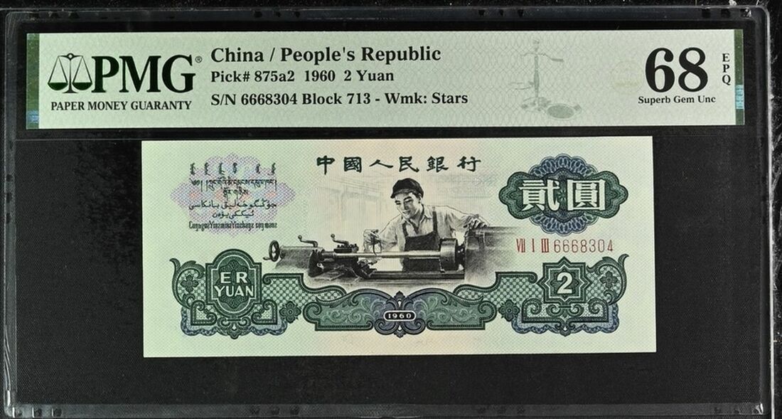 People´s Republic of China, 2 Yuan, 1960, serial number 6668304 Block 713, (Pick 875a2), in PMG holder 68 EPQ Superb Gem Uncirculated