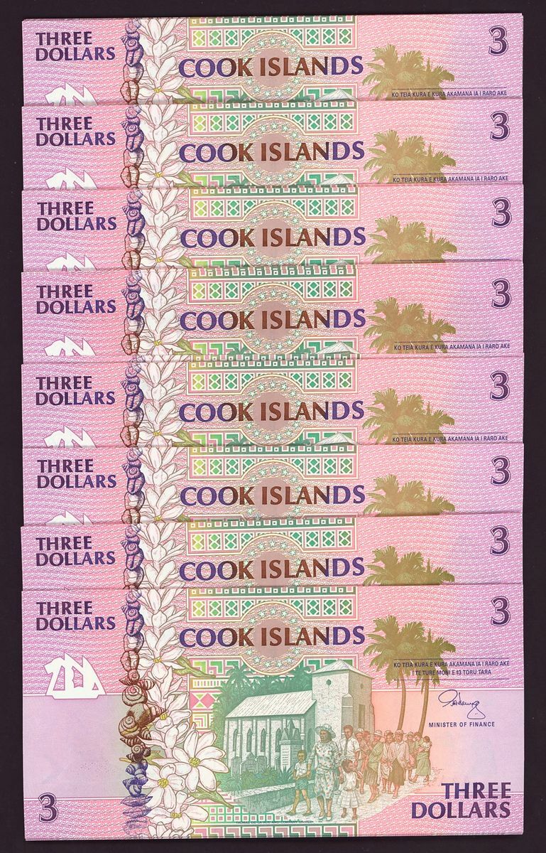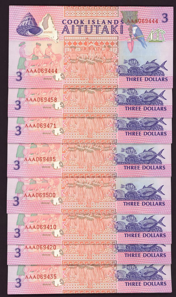 Cook Islands, [100 notes] $3, ND (1992), consecutive serial numbers, consecutive serial numbers AAA 069401-069500