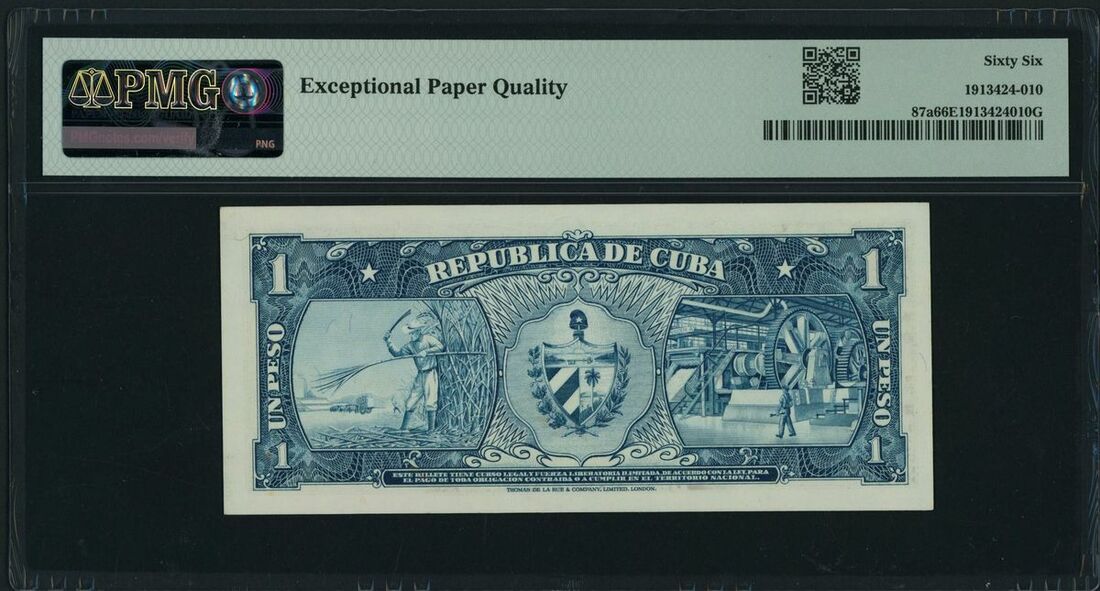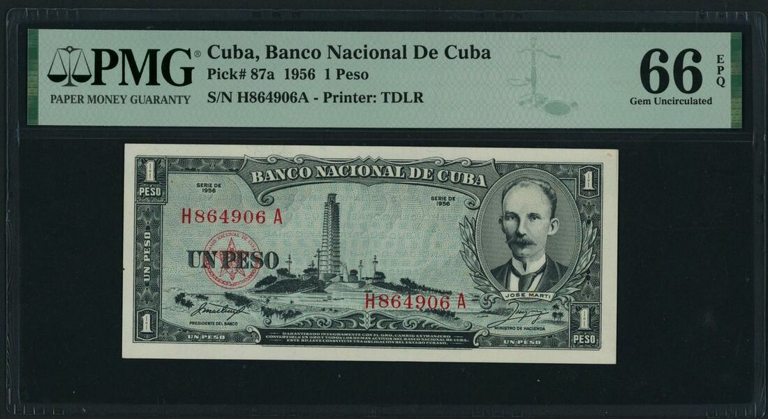 (x) Cuba, Banco Nacional de Cuba, 1 peso, 1956, serial number H864906A, (Pick 87a, BNB 811a), in PMG holder 66EPQ Gem Uncirculated
