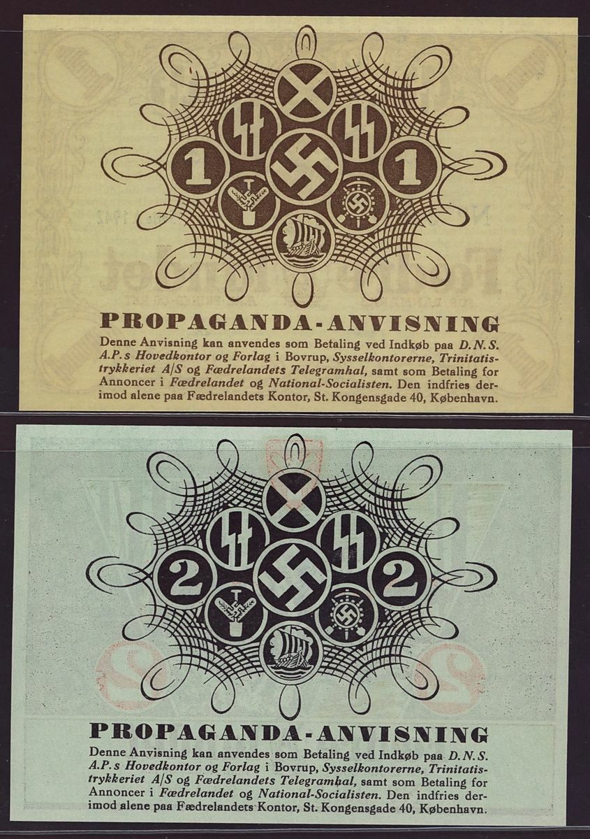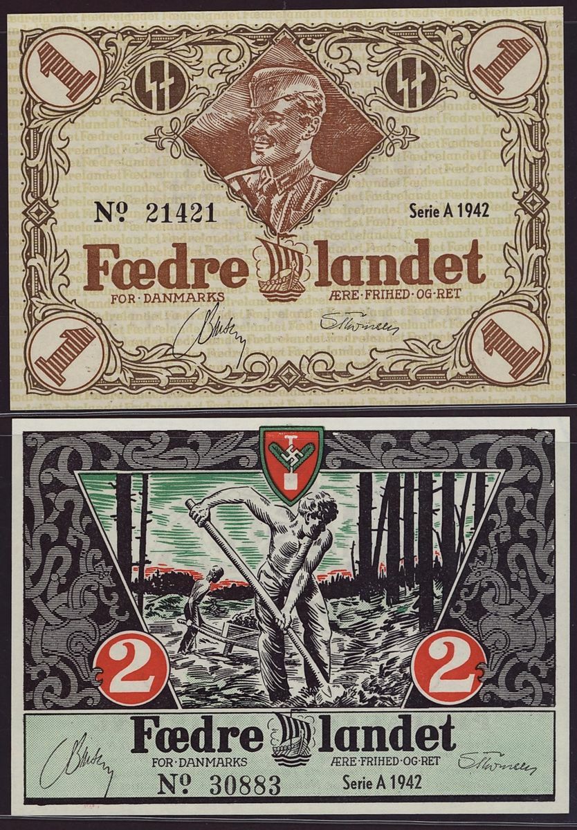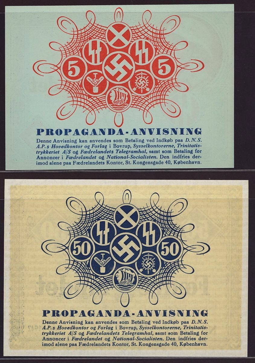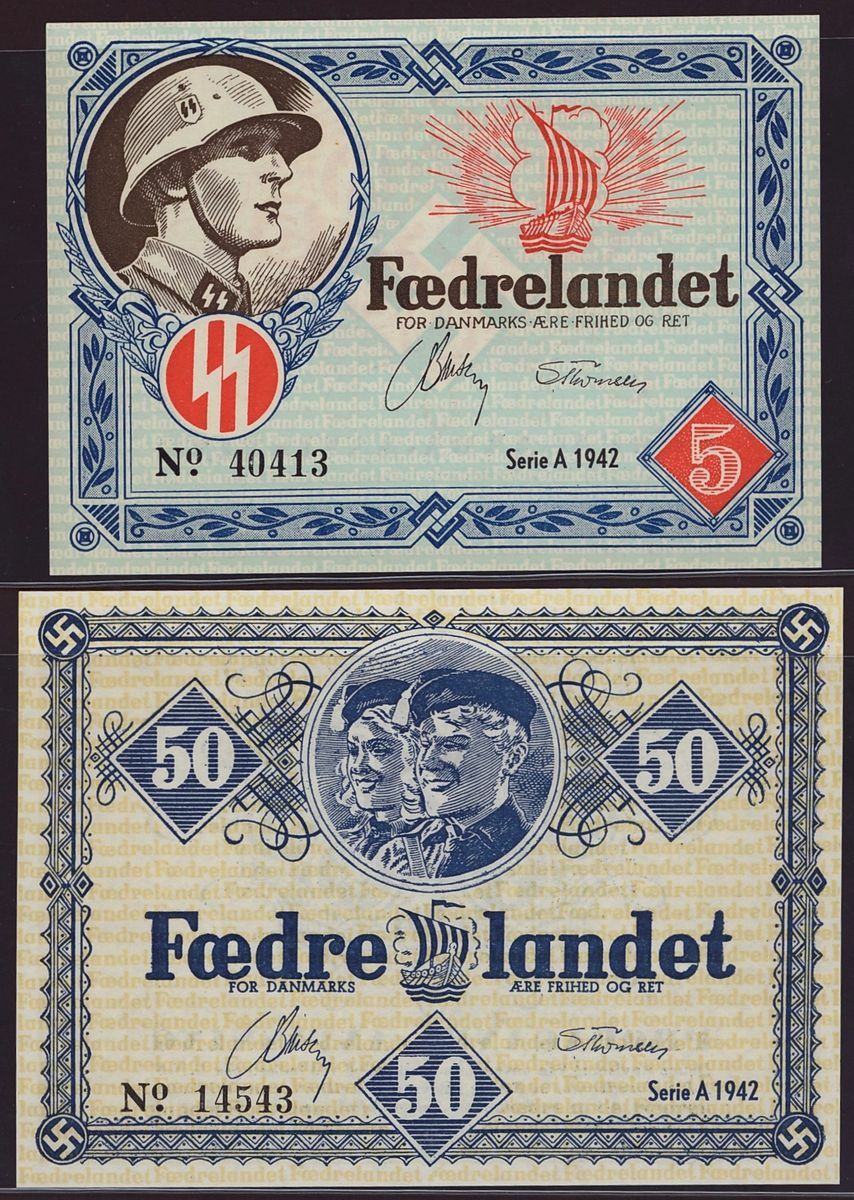 Unissued Danish propaganda notes, [4 notes] 1, 2, 5, 50 ore, 1942, series A, genuine and uncirculated, sold as seen with no returns (4 notes)