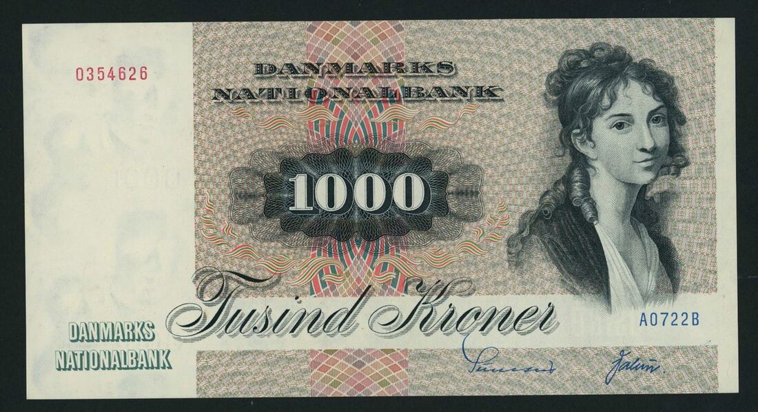 Denmark, National Bank, 1000 kroner, 1992, serial number A0722B, (Pick 53g, BNB 924f), Uncirculated
