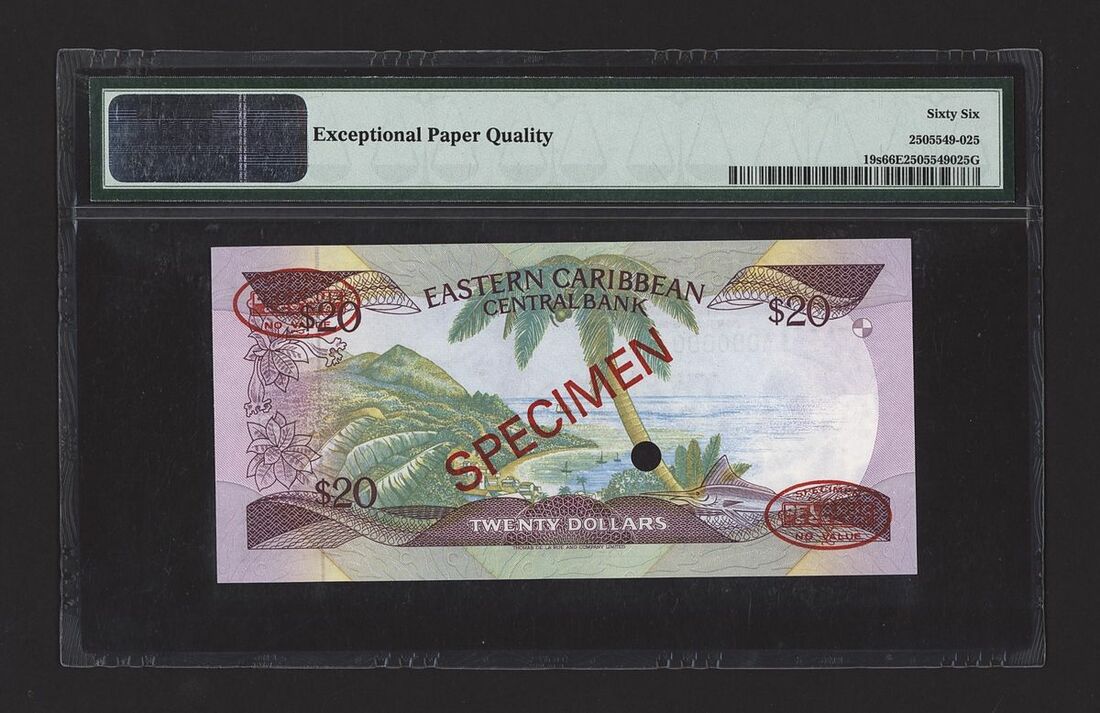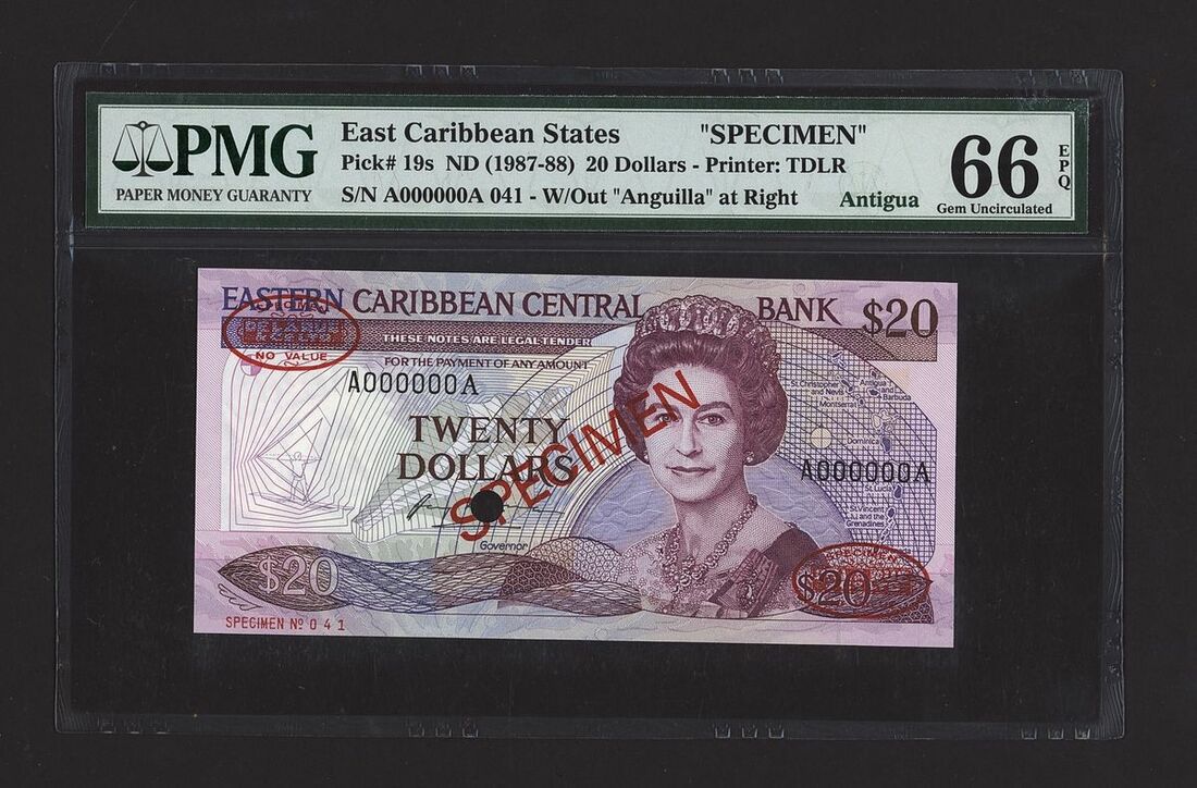 (x) East Caribbean States, specimen 20 Dollars, ND (1987-88), serial number A000000A 041, (Pick 19s, BNB 203), in PMG holder 66 EPQ Gem Uncirculated