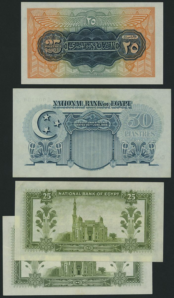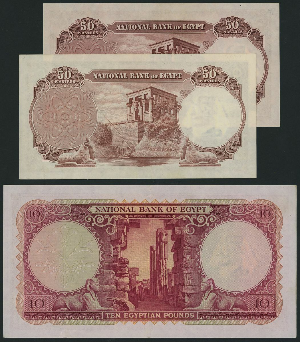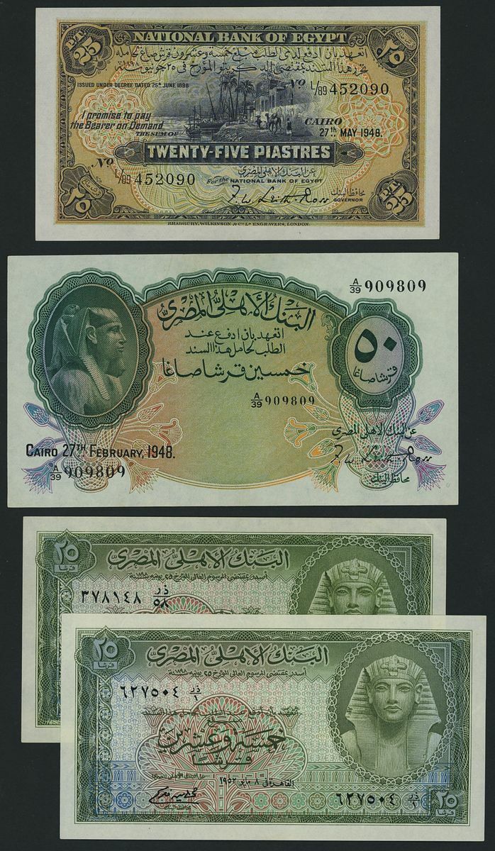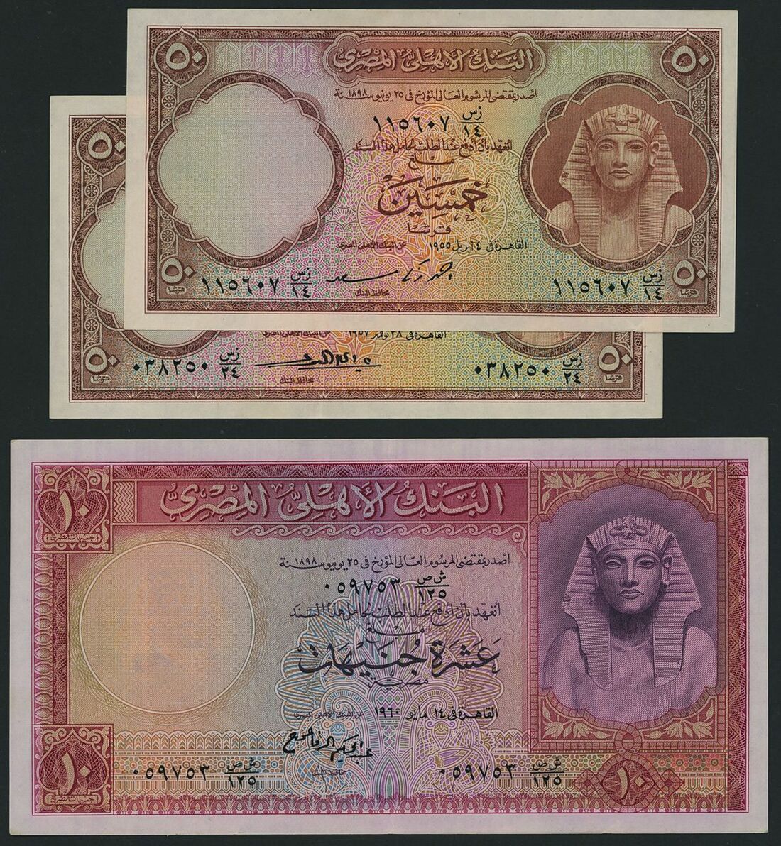 (x) Egypt, National Bank, seven assorted notes, 25, 50 piastres, £10, 1948-1957 (Pick 10d, 21d, 28a, 28c, 29b, 29c, 32c, BNB 108, 120d, 128a, 128c, 129b, 129c, 132c), About Uncirculated to Extremely Fine