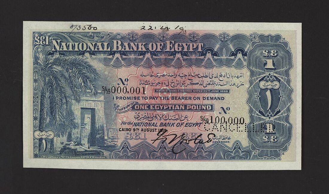 (x) National Bank of Egypt, specimen £1, 9th August 1919, serial number range, (Pick 12s, BNB 110), about uncirculated, horizontal CANCELLED perf.