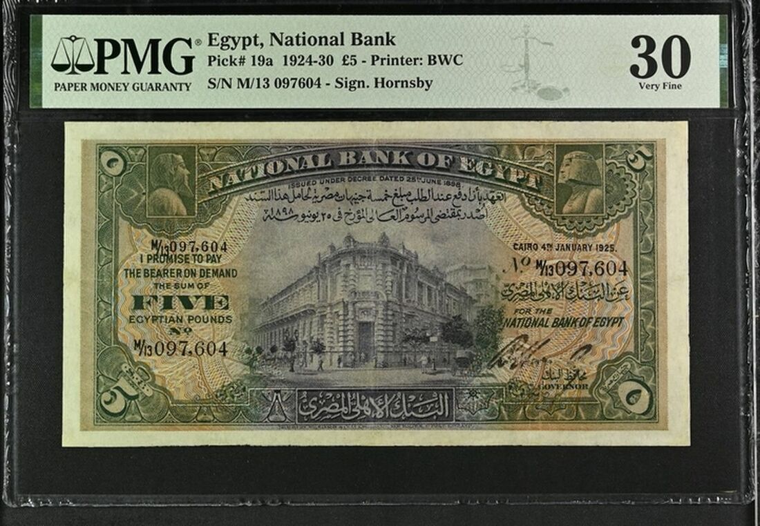National Bank of Egypt, £5, 4th January 1925, serial number M/13 097.604, (Pick 19a, BNB 117a), in PMG holder 30 Very Fine, minor repairs