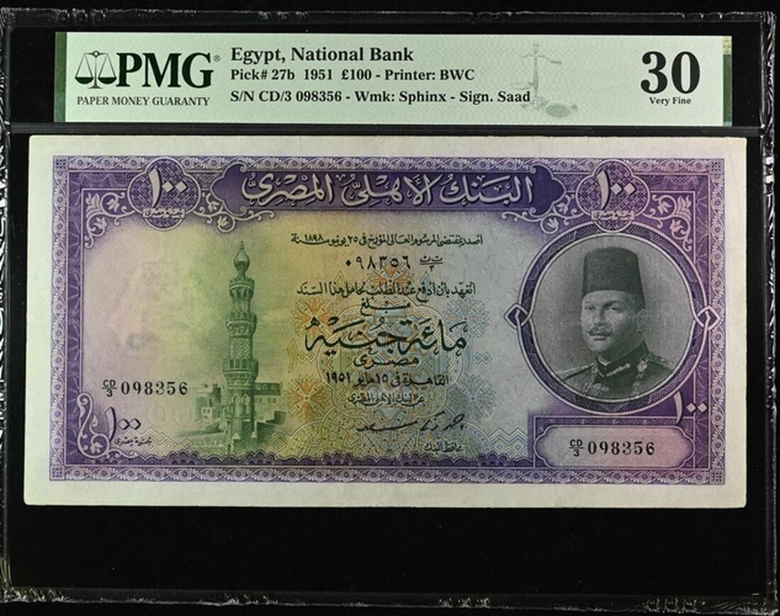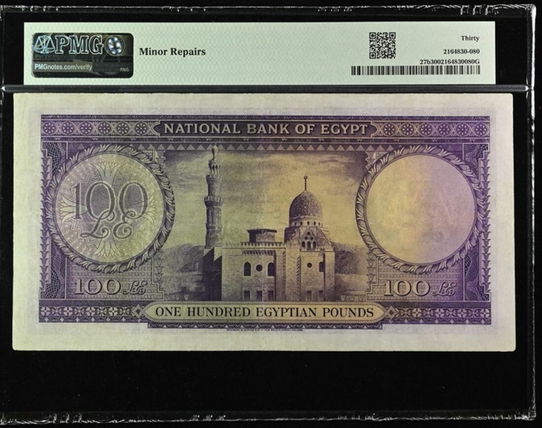 National Bank of Egypt, £100, 15th May 1951, serial number CD/3 098356, (Pick 27b, BNB 127b), in PMG holder 30 Very Fine, minor repairs