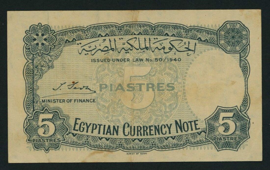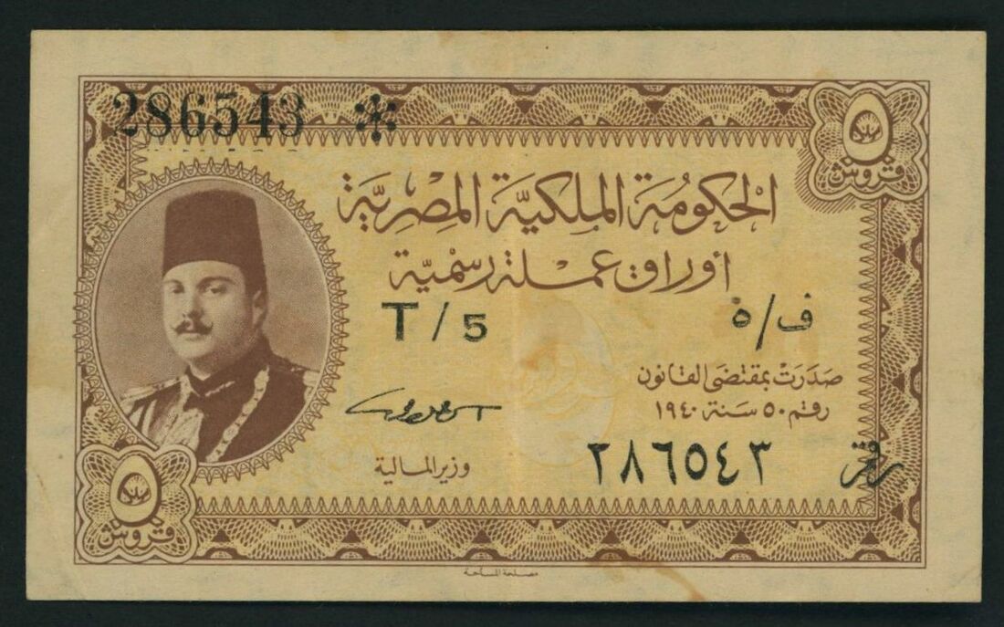 Egypt, Egyptian Government, 5 piastres, ND (1940) Law 50, serial number T/5 286534, (Pick 165a, BNB 212h), Very Fine