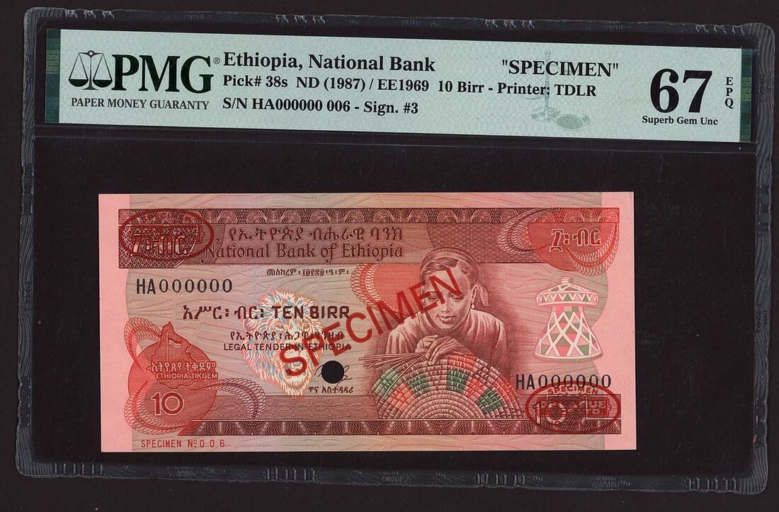 (x) National Bank, Ethiopia, specimen 10 Birr, ND (1987) / EE1969, serial number HA000000 006, (Pick 38s, BNB 313), in PMG holder 67 EPQ Superb Gem Uncirculated