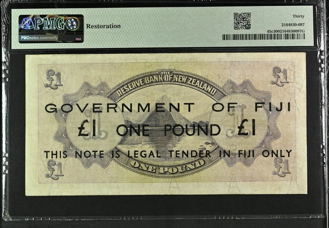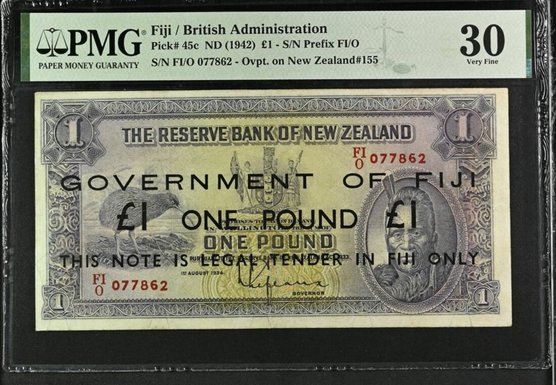 Fiji, British Administration, £1, ND (1942), serial number FI/O 077862, Ovpt. on New Zealand Pick 155,