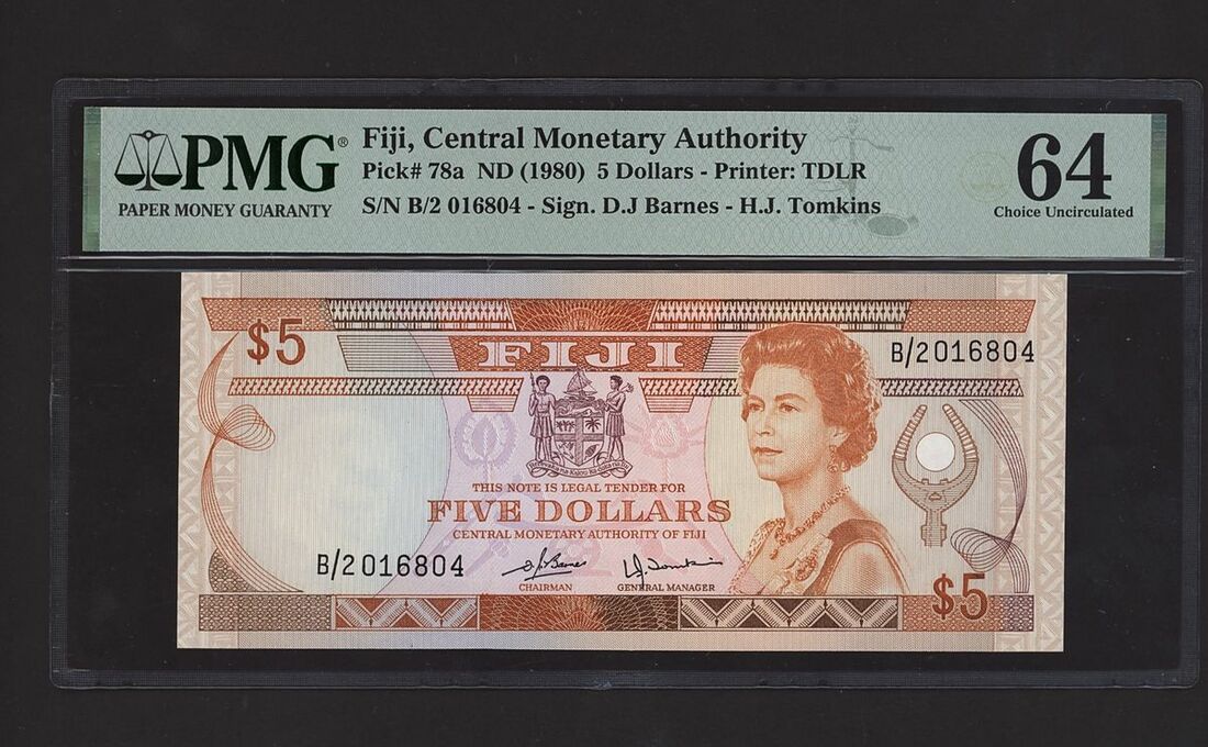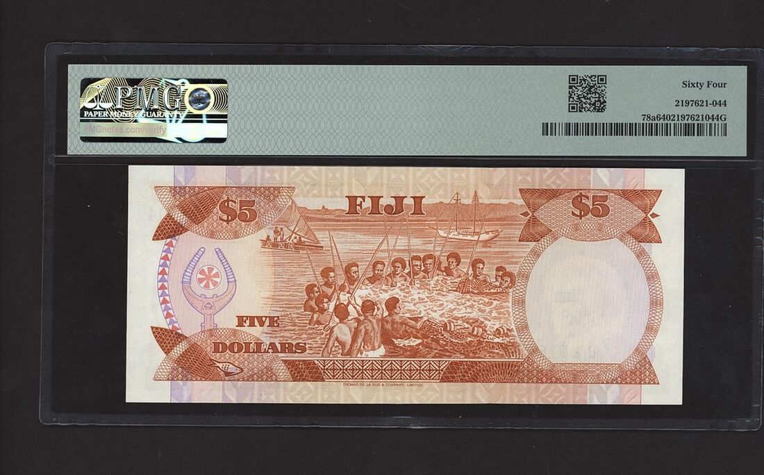 (x) Fiji, British Administration, Central Monetary Authority, [3 notes] two $1, one $5, 1971-80, (Pick 65b, 65b, 78a, BNB 337a, 337a, 409a), all in PMG holders 64 Choice Uncirculated (3 notes)