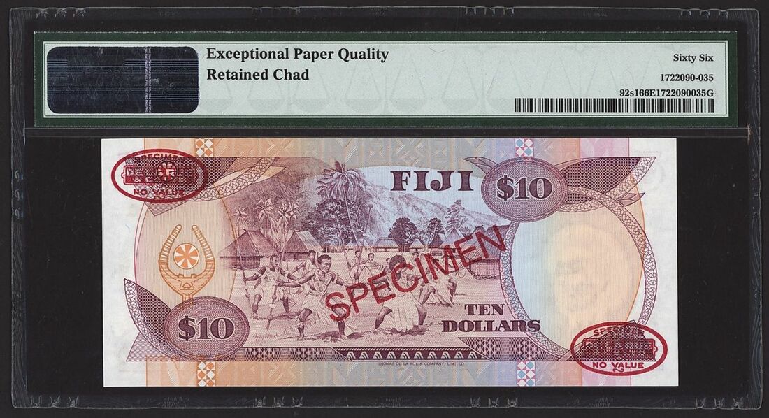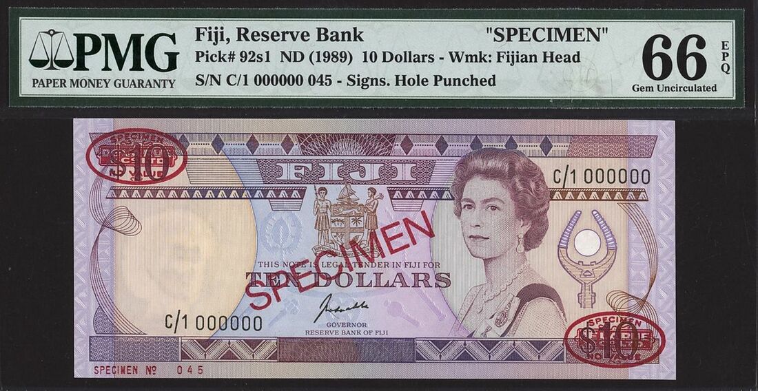 (x) Reserve Bank, Fiji, specimen 10 Dollars, ND (1989), serial number C/1 000000 045, (Pick 92s1, BNB 504), in PMG holder 66EPQ Gem Uncirculated, retained chad