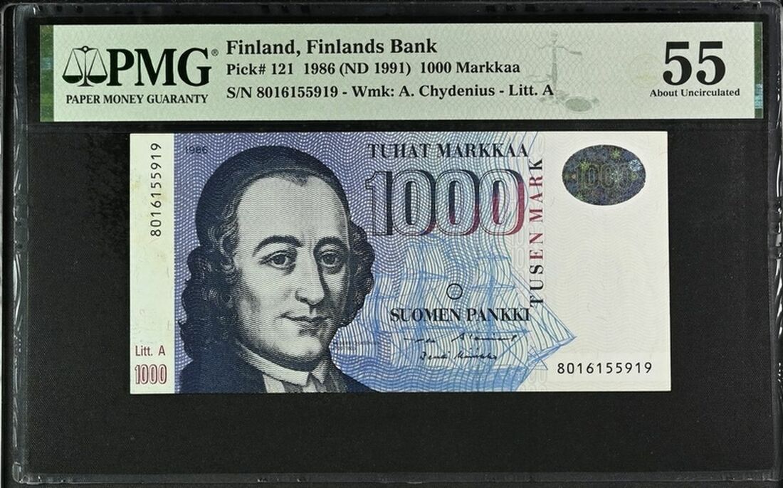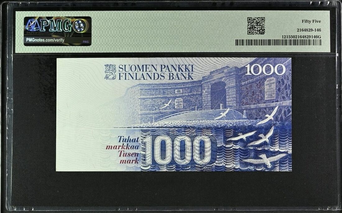 Finlands Bank, Finland, 1000 Markkaa, 1986 (ND 1991), serial number 8016155919, (Pick 121, BNB 406), in PMG holder 55 About Uncirculated