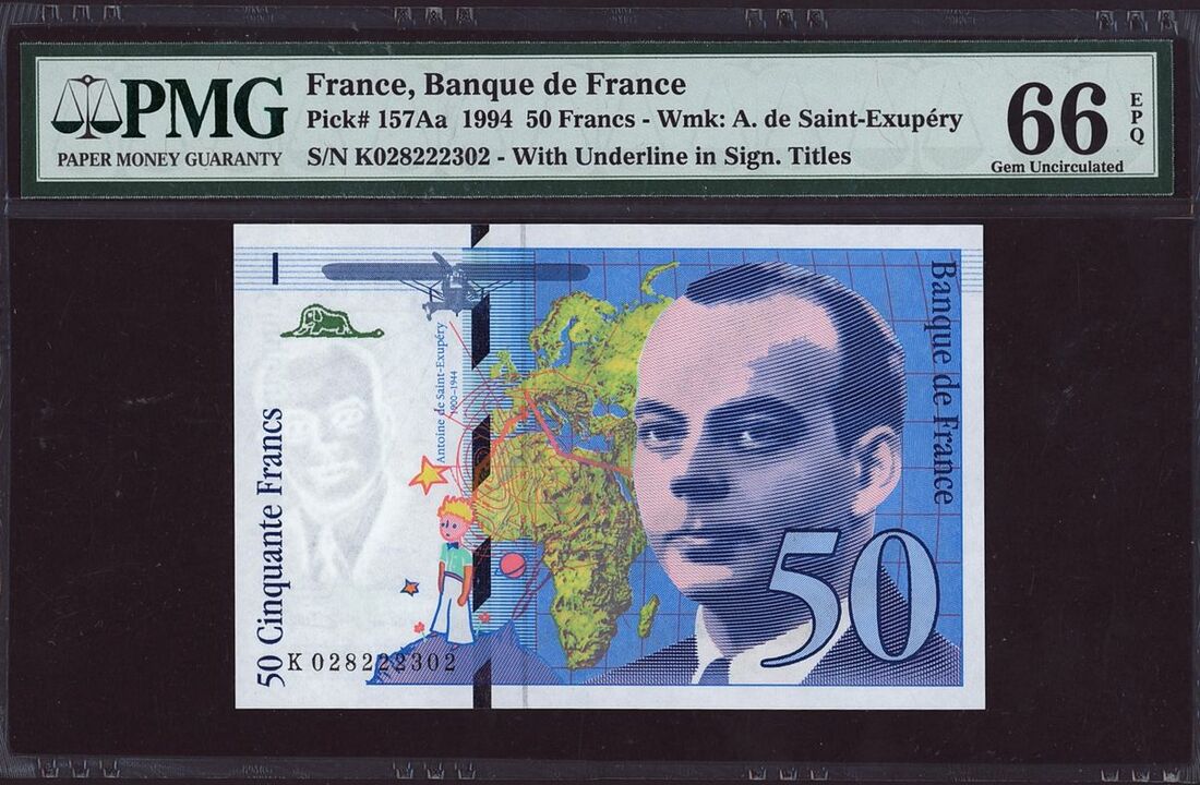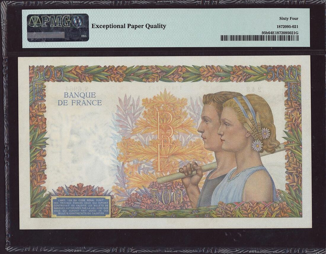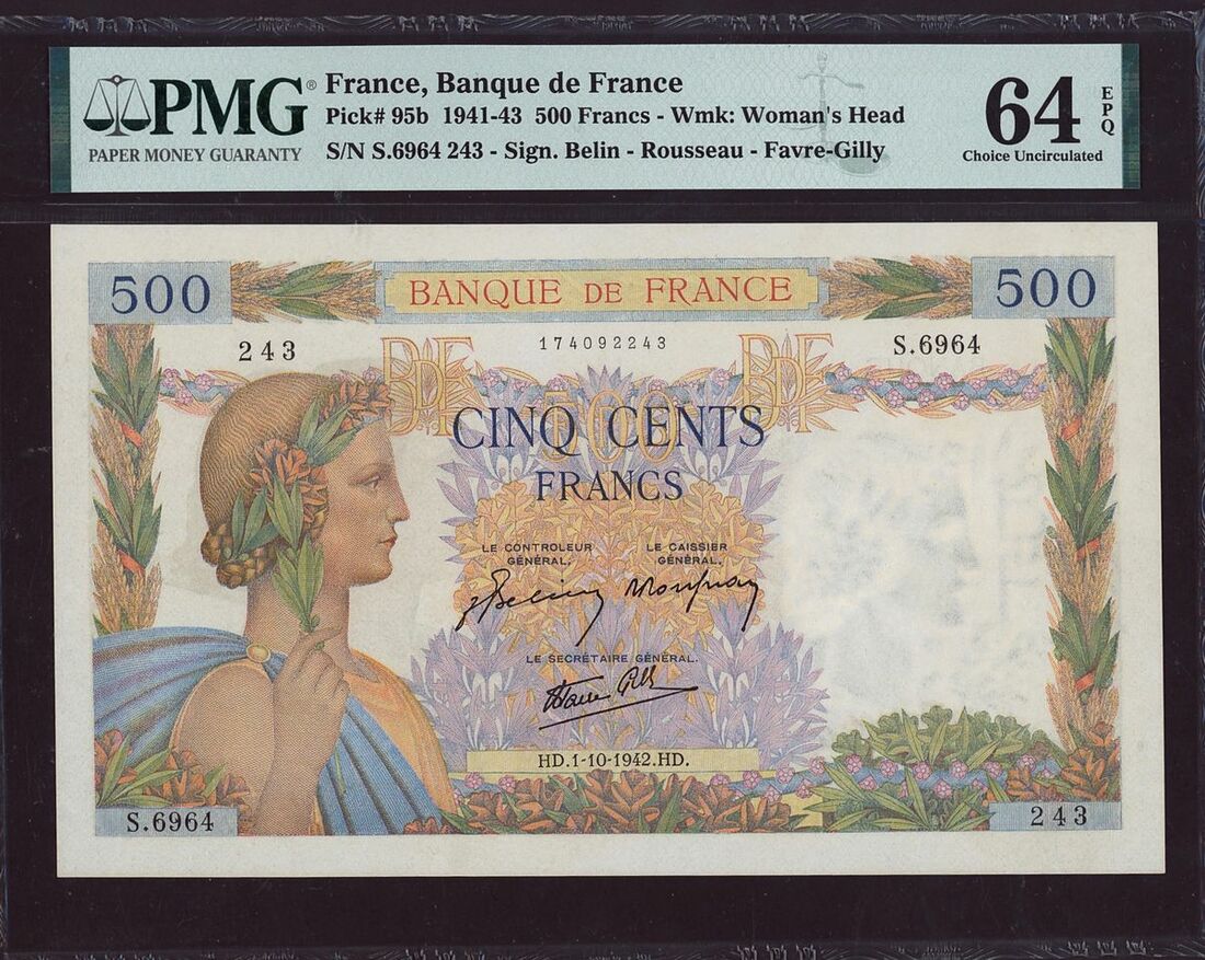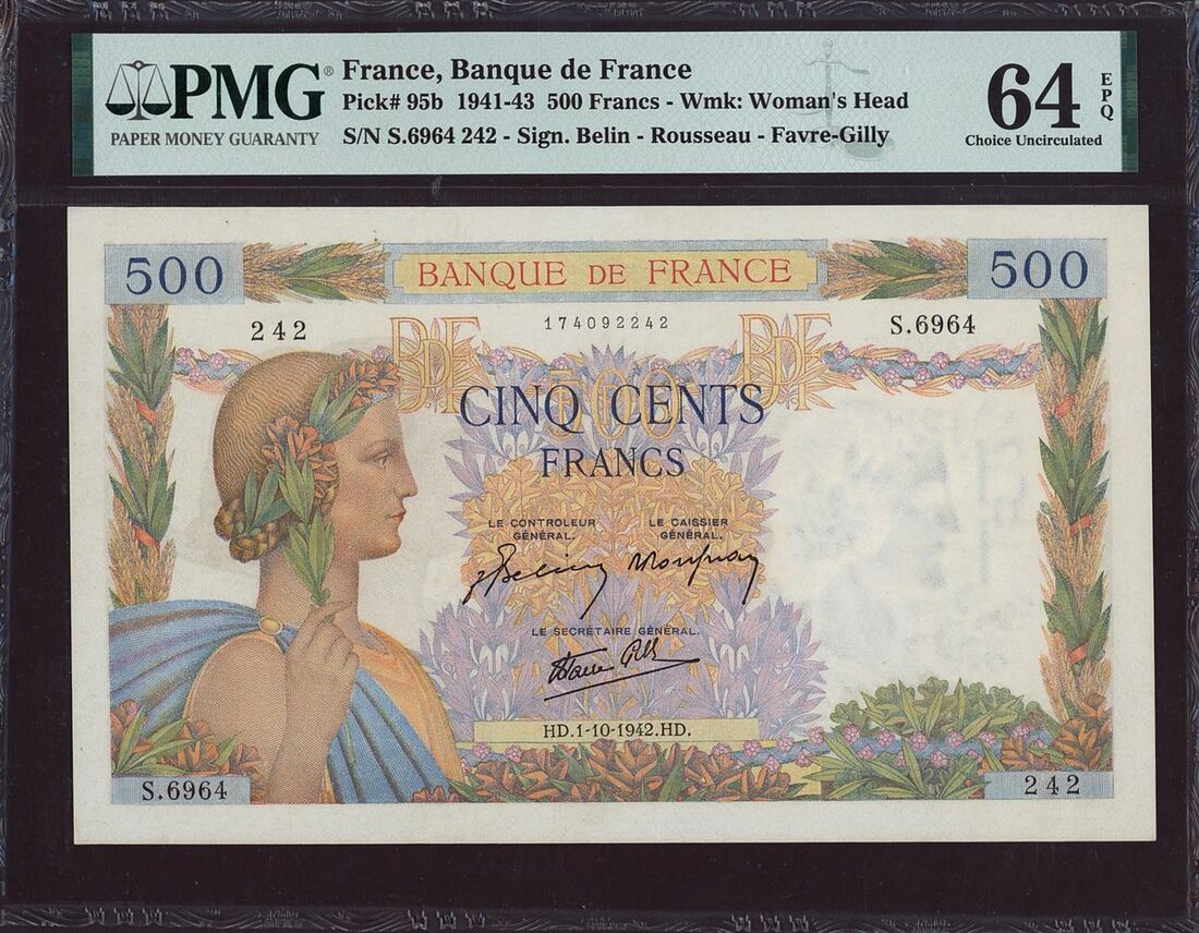 (x) France, Banque de France, five assorted notes, two 500 francs, one 1000 francs, two 50 francs, 1941-94, consecutive serials numbers on the 500 francs notes