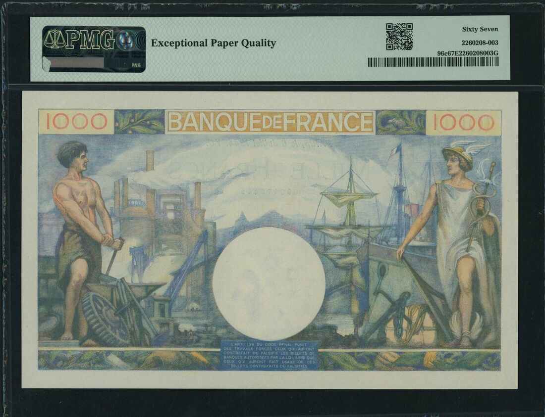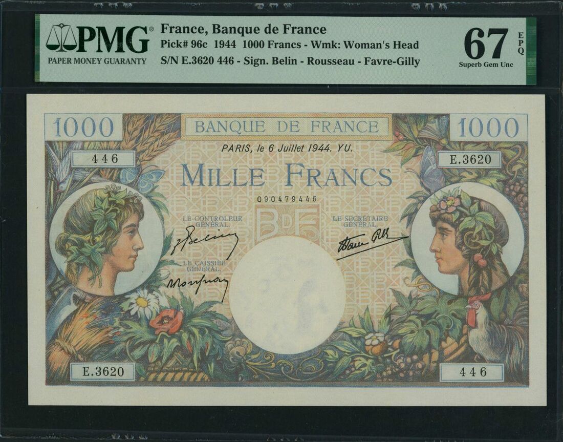 France, Banque de France, 1000 francs, 6th July 1944, serial number E.3620 446, watermark: woman's head