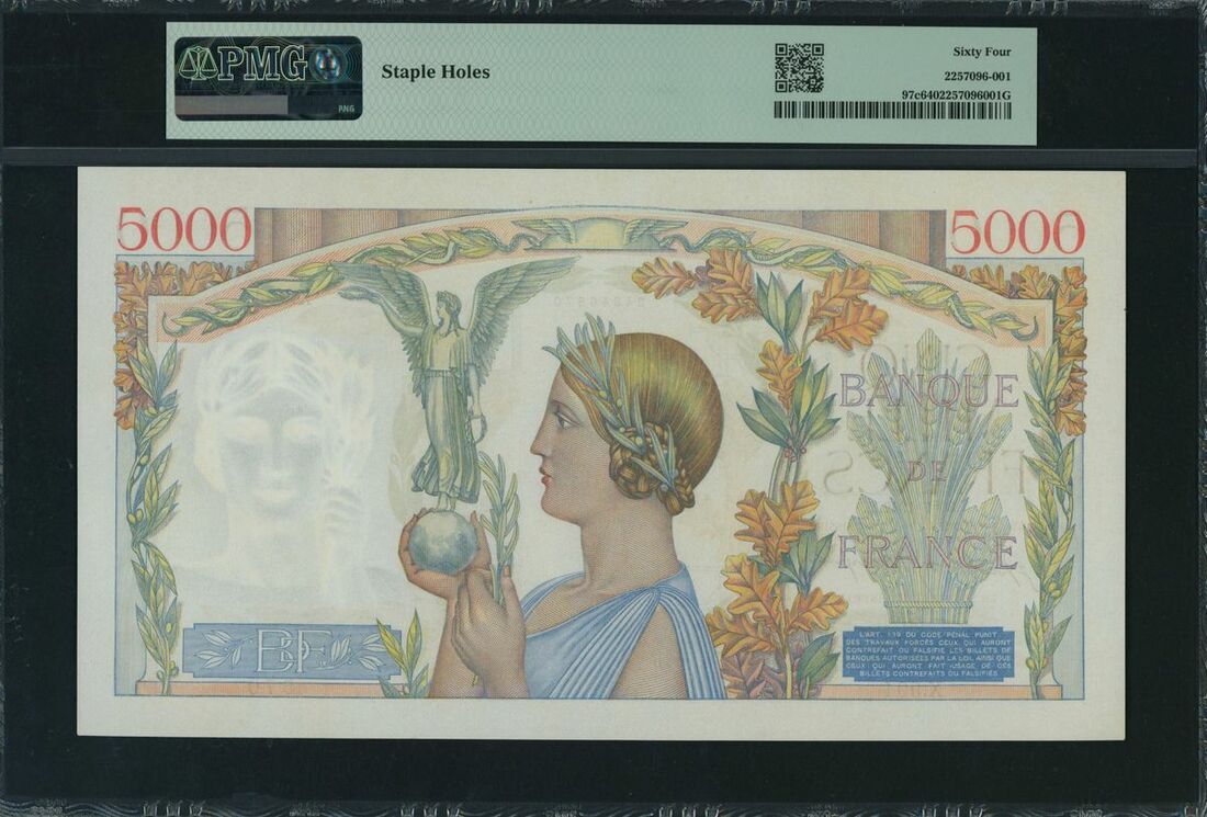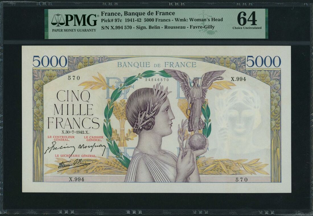 (x) France, Banque de France, 5000 francs, 30th July 1942, serial number X.994570, watermark: woman's head