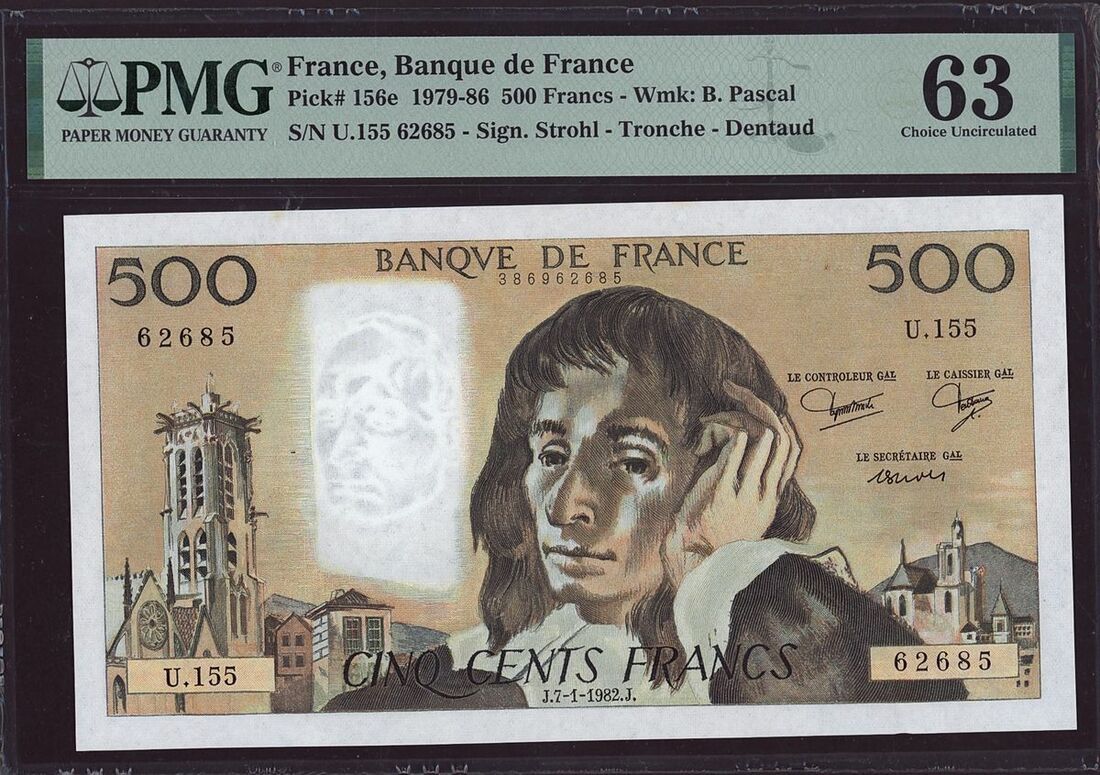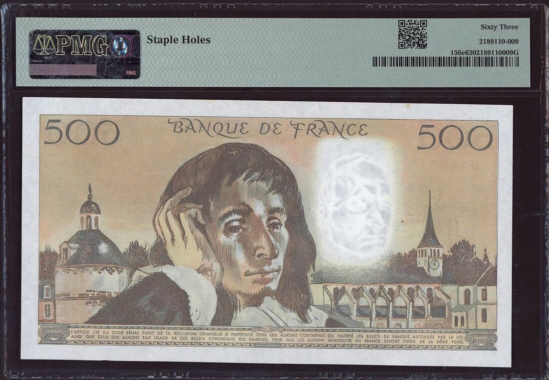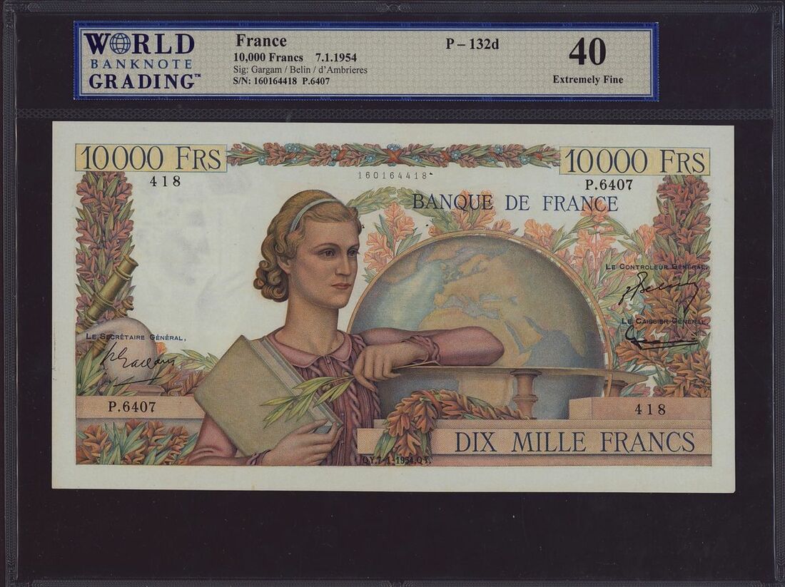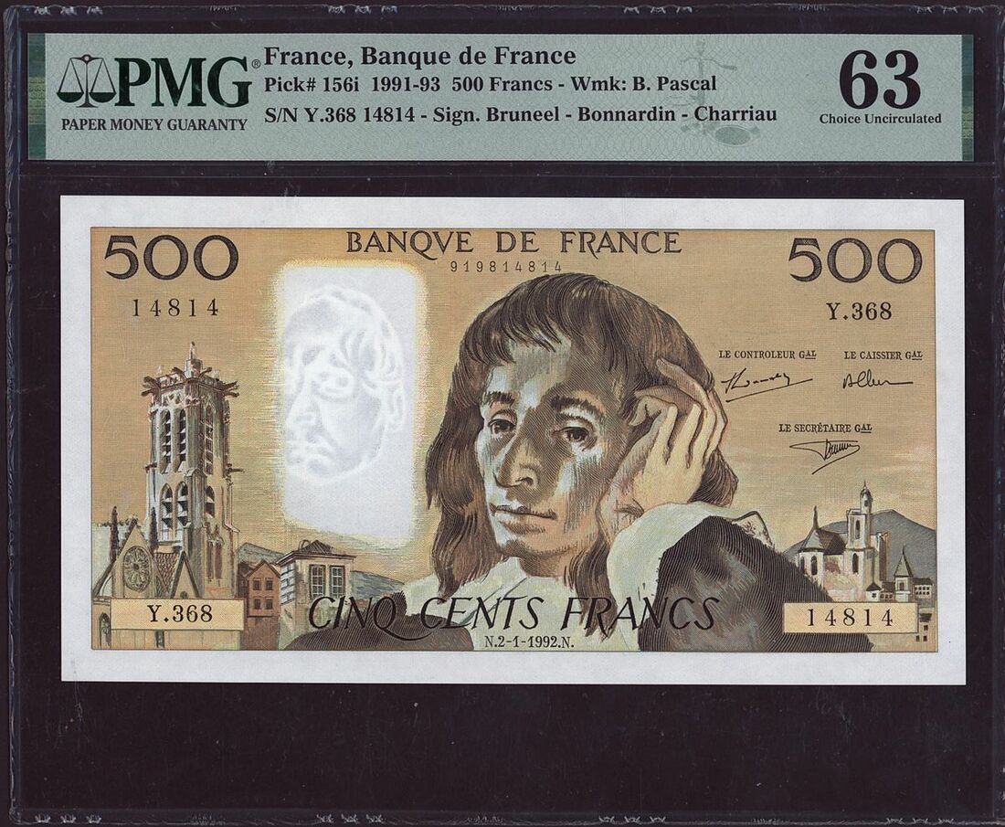 (x) Banque de France, three assorted notes, one 10000 francs, two 500 francs, 1954-1992, (Pick 132d, 156e, 156i), in WBG holder 40 Extremely Fine and PMG holders 63 Choice Uncirculated, 63 Choice Uncirculated, staple holes in all