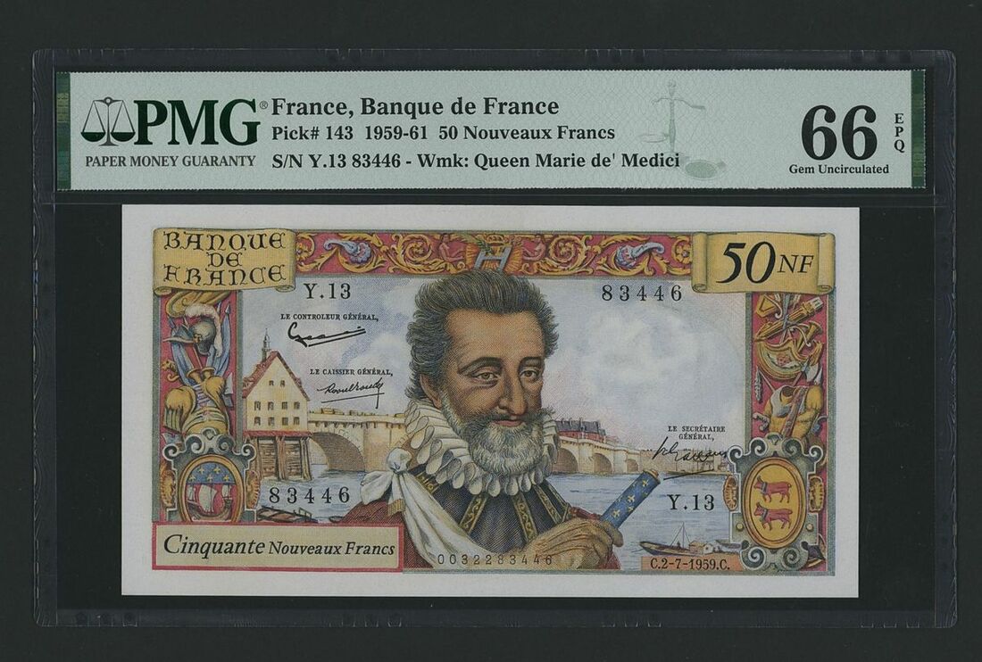 Banque de France, [Top Pop] 50 Nouveaux Francs, 1959, serial number Y.13 83446, the changing economic circumstances in France and its foreign interests prompted the introduction of a new monetary unit known as the 'nouveaux franc.' As seen here, this vibrant banknote showcases striking hues and intricate, symbolic embellishments. Similar to its contemporary designs, this banknote displays a portrait of King Henri IV on both sides. However, there are subtle differences, including distinct background settings and varying hand positions and attire. The design exudes quintessential French artistry