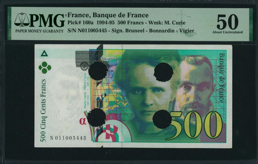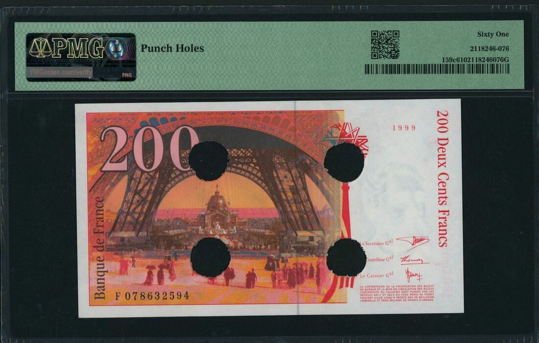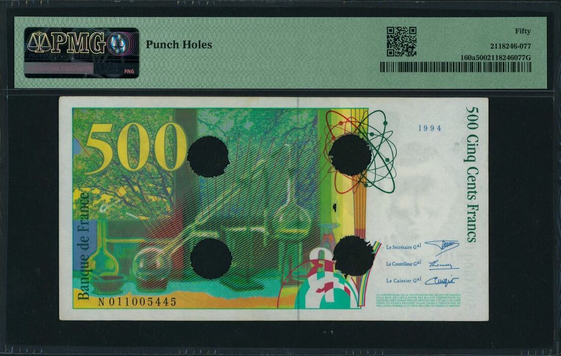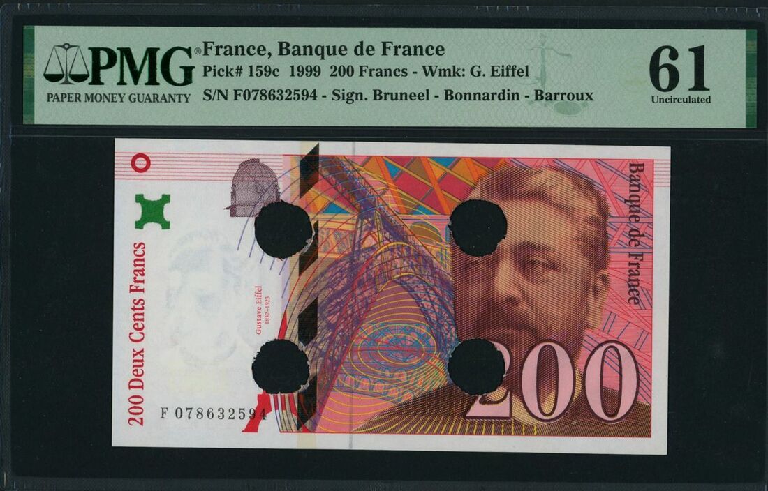 (x) France, Banque de France, [2 notes], 200, 500 francs, 1994-1999, (Pick 159c, 160a), in PMG holders 61 Uncirculated and 50 About Uncirculated, punch holes