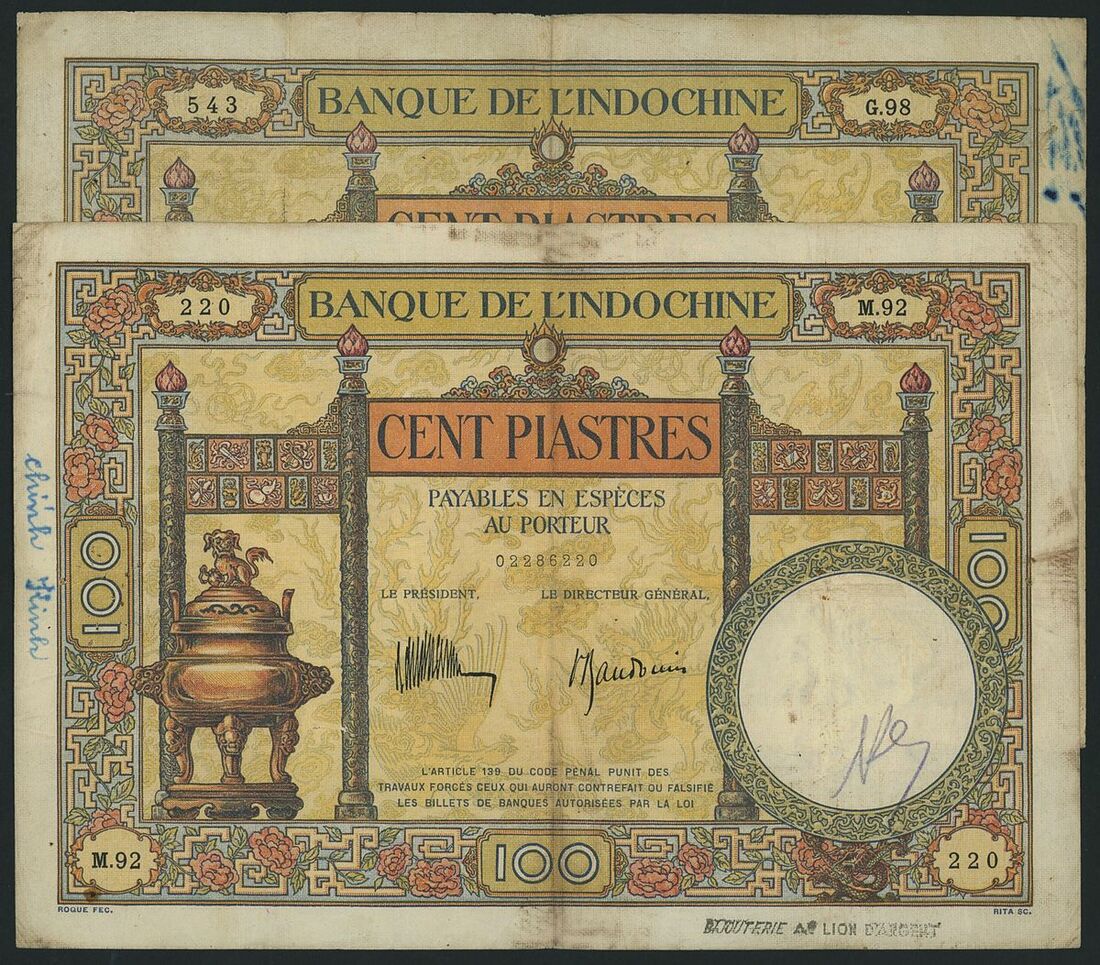 (x) French Indo-China, [4 notes], 100 piastres, ND (1925-36), (Pick 51b, 51c, 51d, 51d), Good, foxing, graffiti and holes present