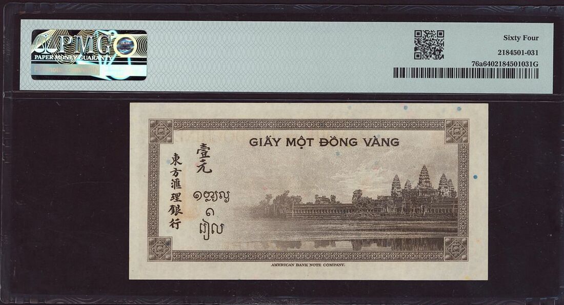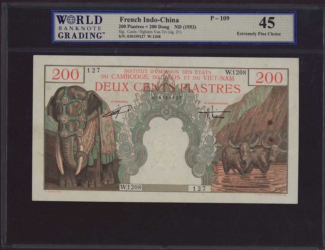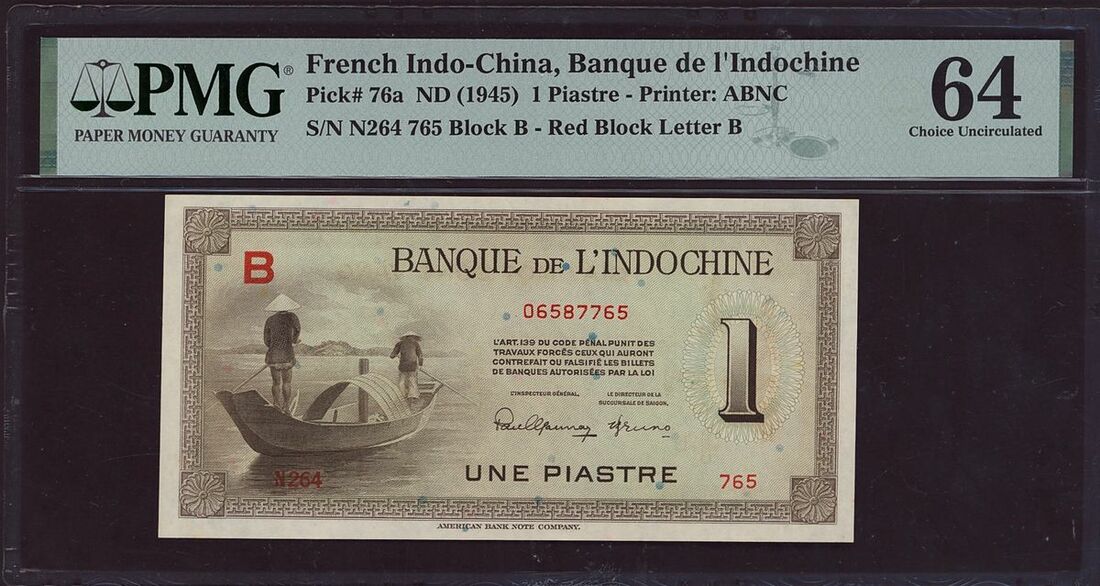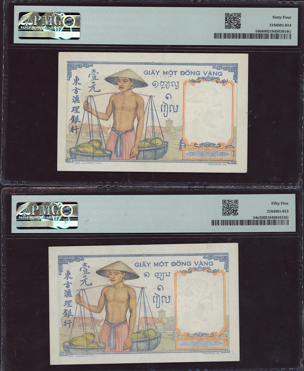 (x) Banque de l'Indochine, French Indo-China, four assorted notes, three 1 piastre, one 200 piastres, ND (1936-53), (Pick 54b, 54e, 76a, 109a, BNB BIC Bb, BIC Be, BIC Bb), in PMG holders 64 Choice Uncirculated, 55 About Uncirculated, 64 Choice Uncirculated and WBG holder 45 Extremely Fine Choice, staple holes and rust on 200 piastres note