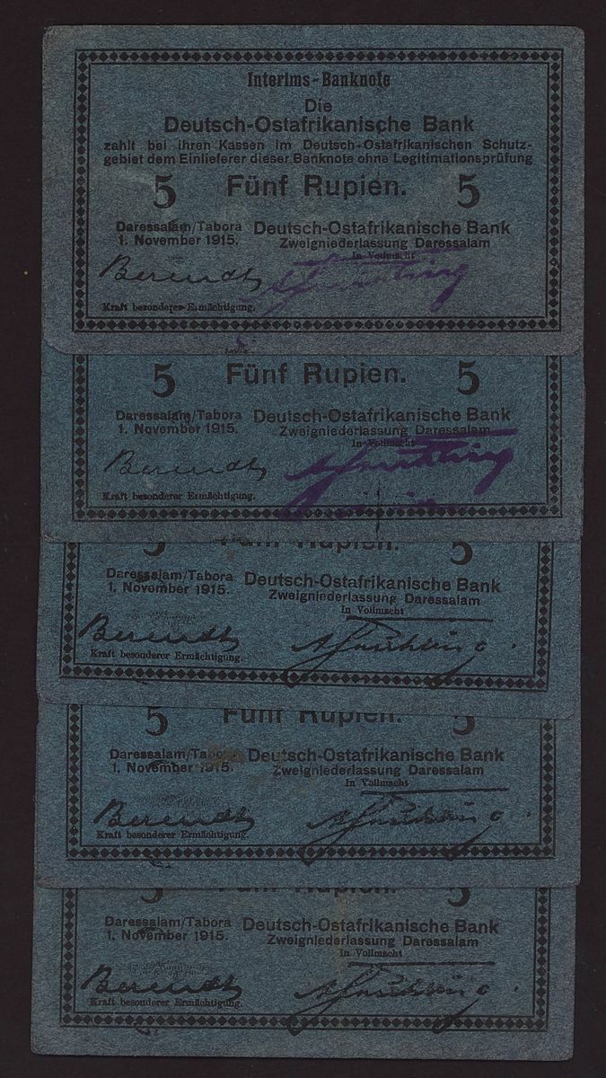Deutsch-Ostafrikanische Bank, German East Africa, group of 5 rupien, 1st November 1915, serial numbers E78101, E78161, consecutive serial numbers E97545-7