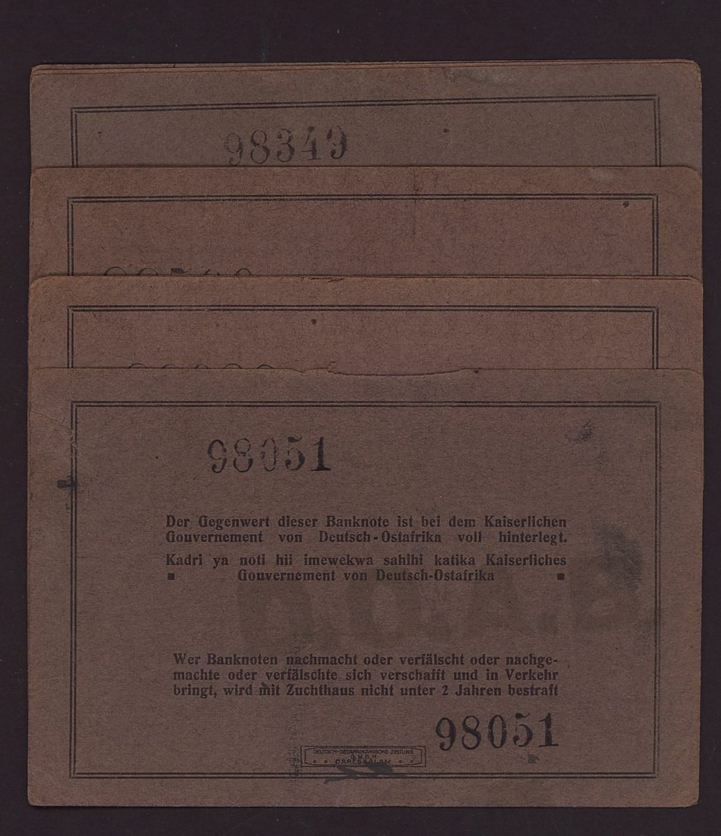 Deutsch-Ostafrikanische Bank, German East Africa, group of 10 rupien, 1st October 1915 (Pick 38a), corners damaged, some minor edge damage, tear on one, otherwise paper extremely fine (8 notes)