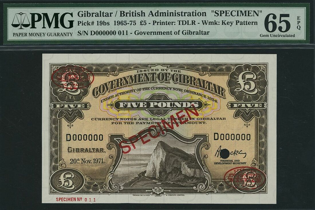 (x) Government of Gibraltar / British Administration, specimen £5, 20th November 1971, serial number D000000 011, (Pick 19bs, BNB 117), in PMG holder 65 EPQ Gem Uncirculated