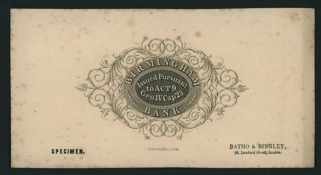 Birmingham Bank, Reverse specimen, Batho & Bingley, London, black and white, for Attwoods, Spooner & Co.,