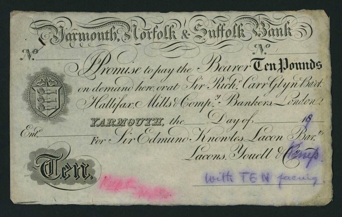 Yarmouth, Norfolk & Suffolk Bank, £10, 18--, no serial number, for Sir Edmund Knowles Lacon Bart, Lacons, Youell & Kemp,