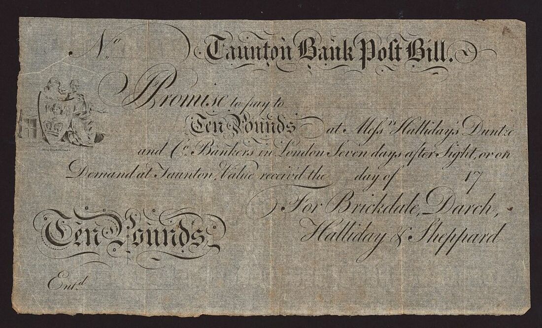 Great Britain, Taunton Bank Post Bill, £10, 17-- (1782-96), no serial number, for Brickdale, Darch, Halliday & Sheppard,