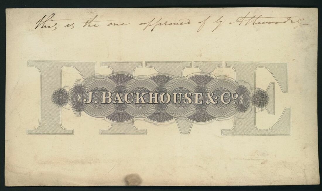 J. Backhouse & Co, Reverse proof on card for £5, black and white, value and partnership name at centre, extremely fine