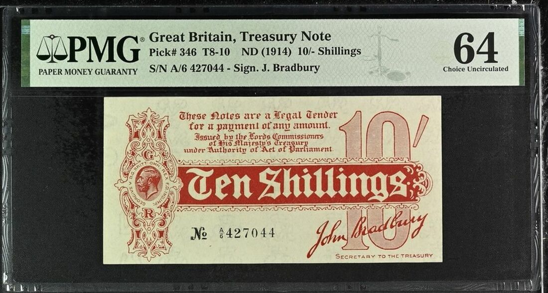 Treasury Note, Great Britain, 10 Shillings, ND (1914), serial number A/6 427044, (Pick 346, BNB 501), in PMG holder 64 Choice Uncirculated, only 9 notes in a higher grade