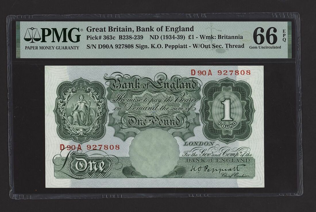 Bank of England, K. O. Peppiatt, £1, ND (1934-39), serial number D90A 927808, (Pick 363c, BNB 172, EPM B238-239), in PMG holder 66 EPQ Gem Uncirculated