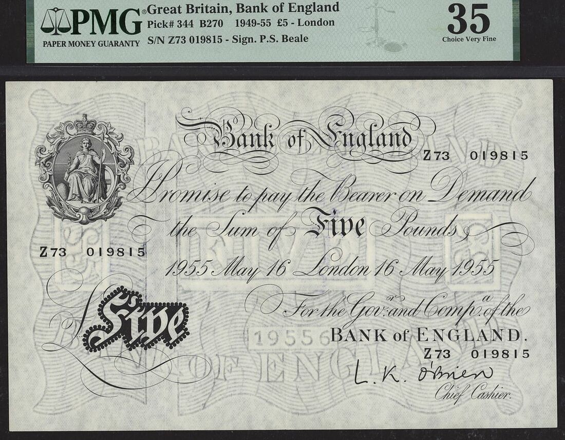 (x) Bank of England, P.S. Beale, £5, 16th May 1955, serial number Z73 019815, (EPM B270), in PMG holder 35 Choice Very Fine,